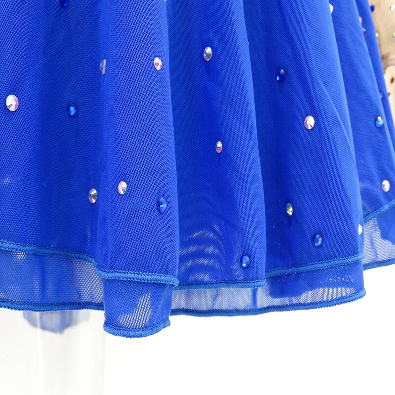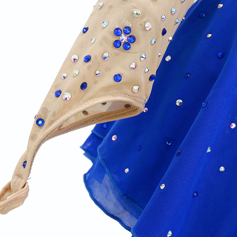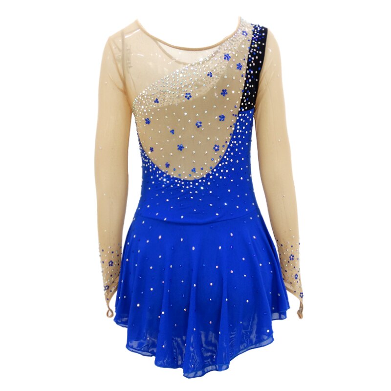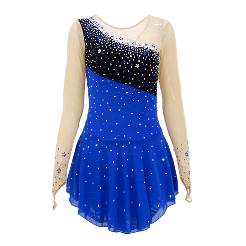 ❤ Features:This LIUHUO figure skating dress features a blue skirt part adorned with sparkling rhinestones, a black upper section also embellished with rhinestones, and sheer beige sleeves that have rhinestone decorations too. It has an elegant design suitable for ice skating performances.