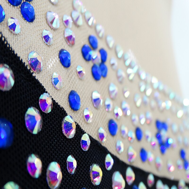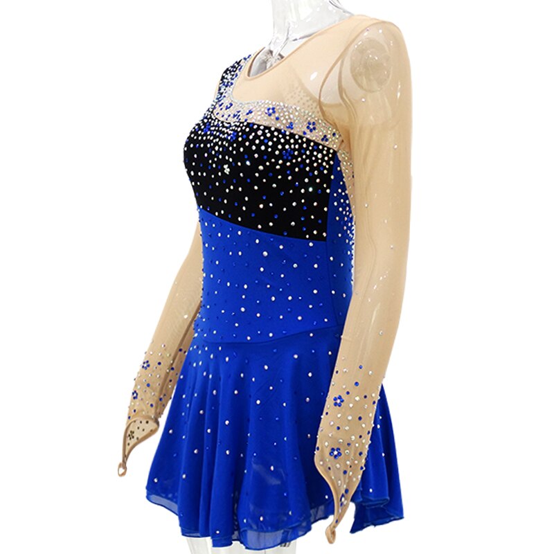 ❤ Features:This LIUHUO figure skating dress features a blue skirt part adorned with sparkling rhinestones, a black upper section also embellished with rhinestones, and sheer beige sleeves that have rhinestone decorations too. It has an elegant design suitable for ice skating performances.