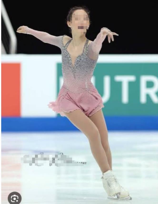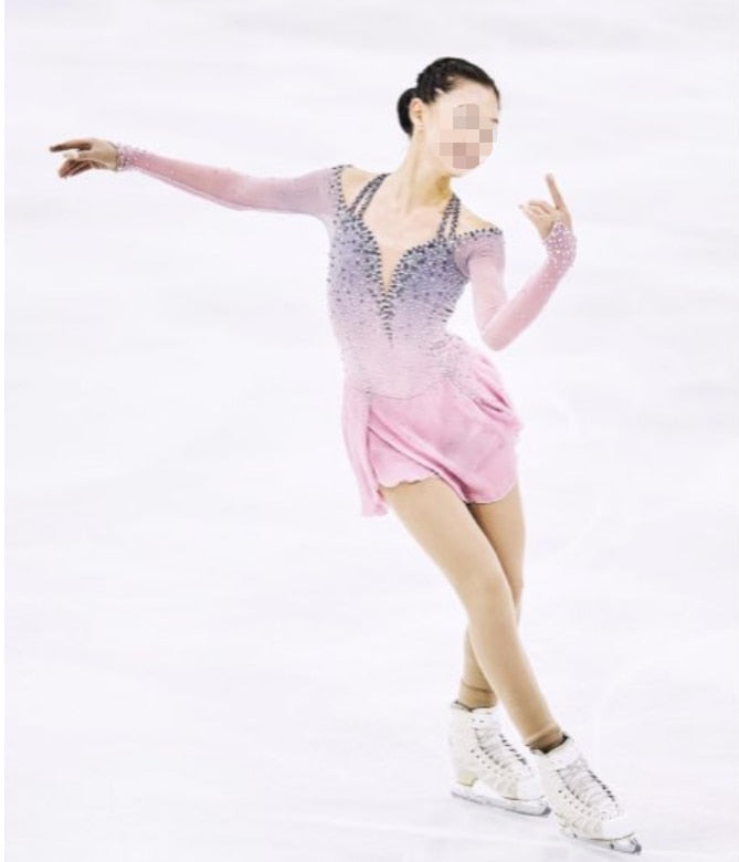 ❤ Features:This figure - skating dress is an elegant choice. It features a sleeveless, deep V - neck design on the bodice, which is densely embellished with sparkling rhinestones creating a gradient effect from silver at the top to soft pink at the bottom. The long, sheer sleeves add a delicate touch. The flared skirt, also in pink, complements the overall look. This design not only offers a glamorous appearance but also allows for a wide range of motion, making it suitable for figure - skating performances.