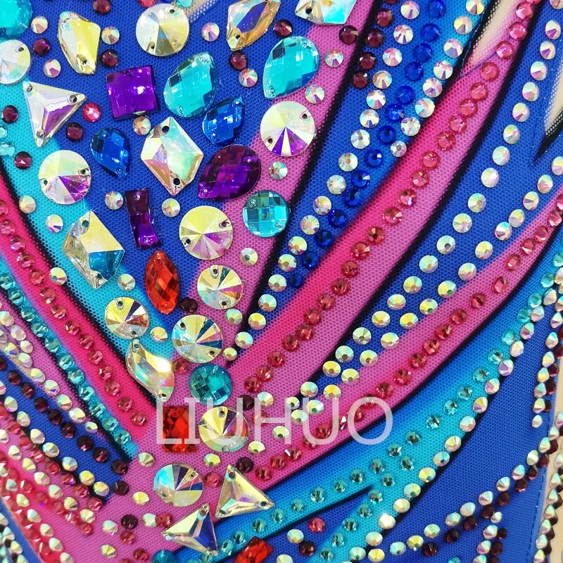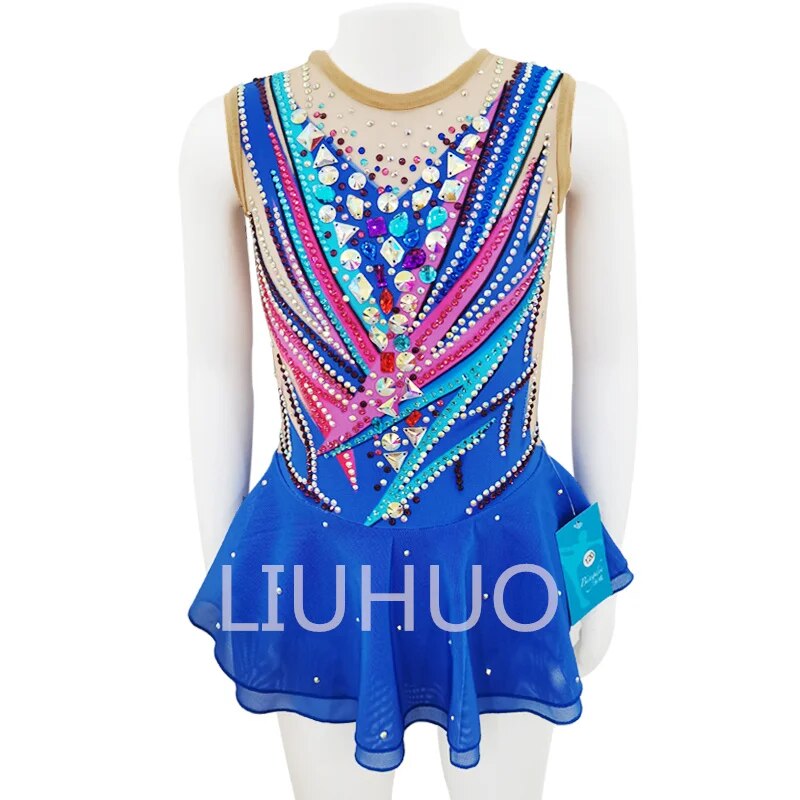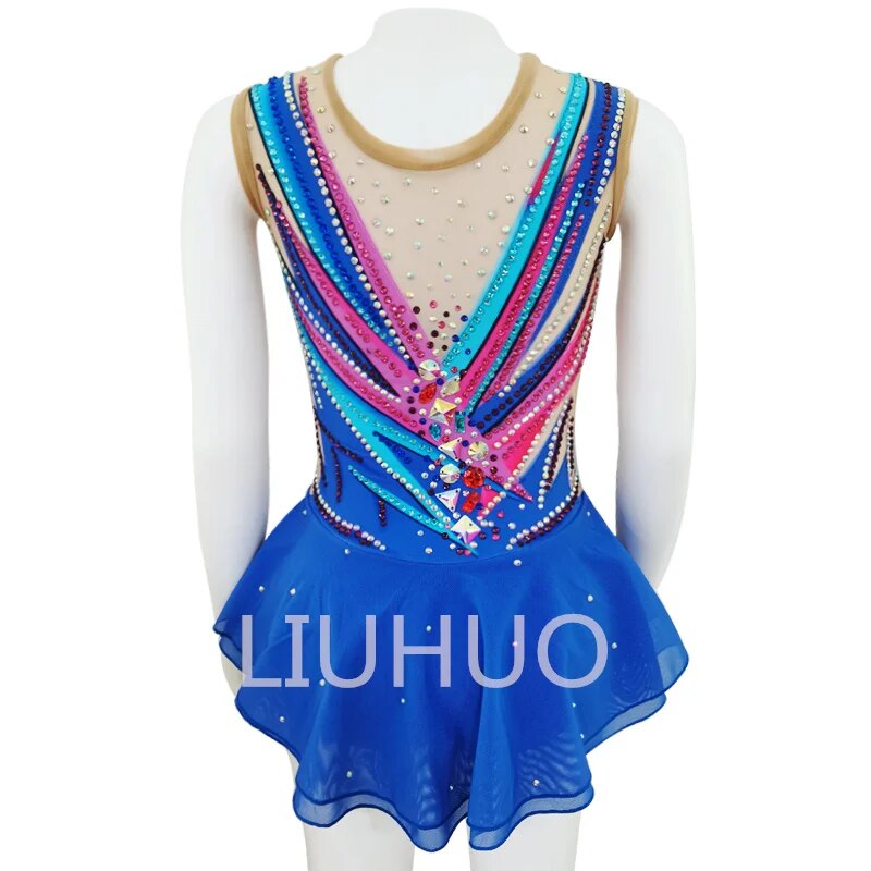 ❤ Features:This LIUHUO figure - skating dress is a vibrant and eye - catching piece. The sleeveless top features a sheer mesh neckline, adorned with an array of colorful rhinestones arranged in dynamic, zigzag patterns. Shades of blue, pink, and purple blend together, creating a lively and energetic look. The flared blue skirt, embellished with small rhinestones, adds a touch of grace. It's a perfect combination of sparkle and style, designed to make a statement on the ice.