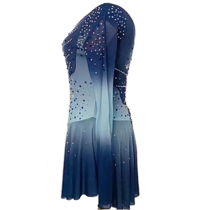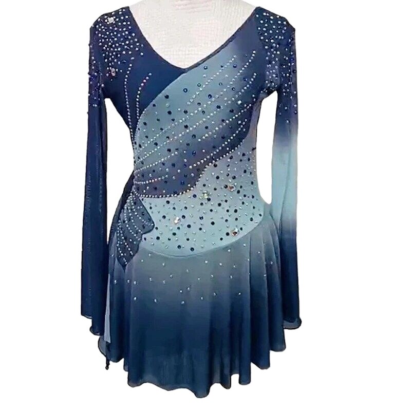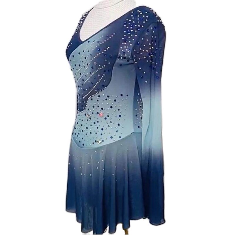 ❤ Features:This LIUHUO skating dress is a stunning creation. It features long sleeves and a captivating gradient color scheme transitioning from a deep blue at the top to a lighter blue towards the bottom. The dress showcases a unique wrap - around design on the bodice, adorned with an array of sparkling rhinestones meticulously arranged in patterns that add a touch of glamour.