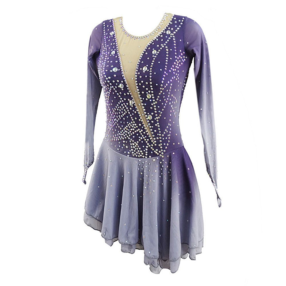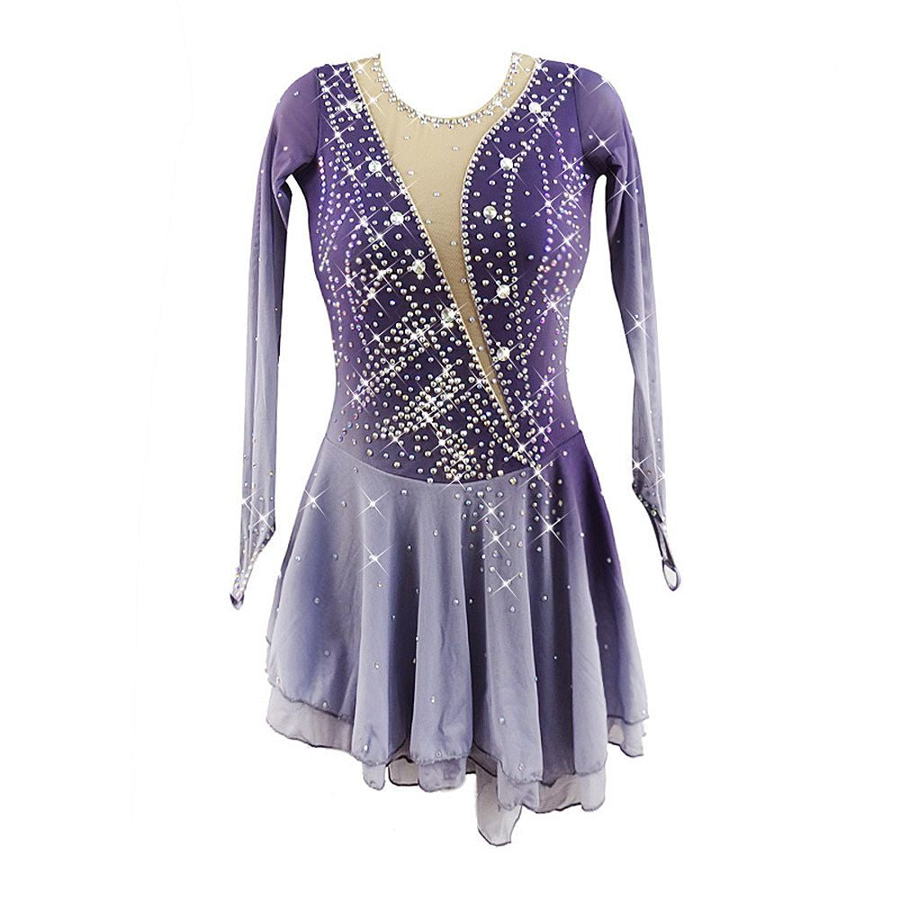 ❤ Features:This LIUHUO figure skating dress showcases a gradient from purple to light gray. It features long sleeves and a round - like neckline with a sheer beige insert. The dress is richly decorated with sparkling rhinestones, forming intricate patterns across the bodice and skirt, adding a touch of elegance and glamour for skaters.