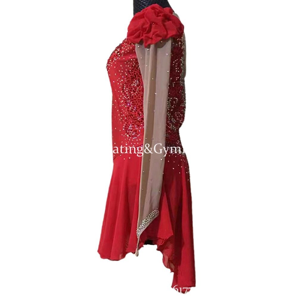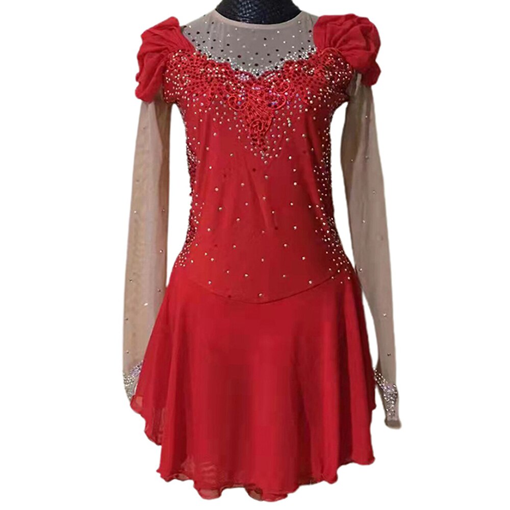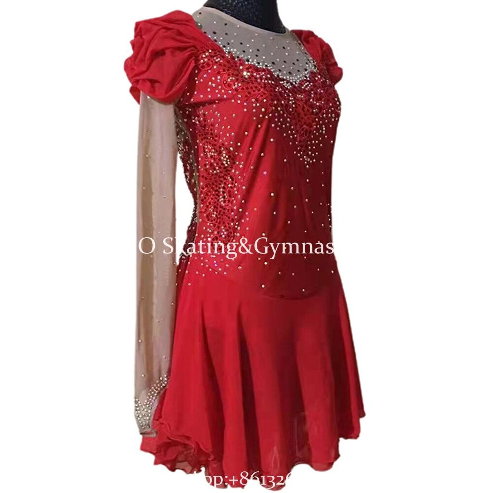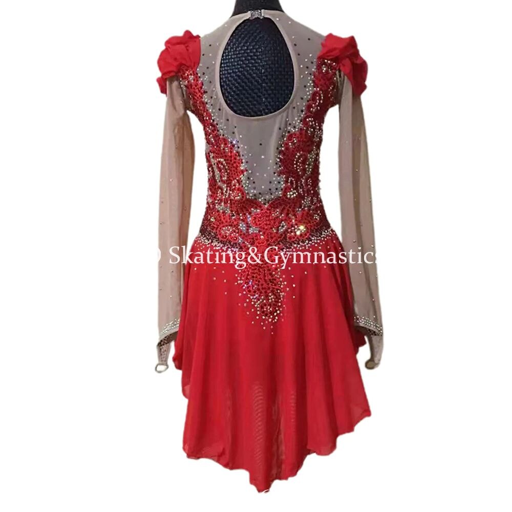 ❤ Features:This LIUHUO figure - skating dress is a striking and glamorous choice. Its vivid red hue immediately commands attention, radiating energy and enthusiasm. The puffed shoulders add a nostalgic yet regal touch, while the sheer long sleeves, embellished with shimmering details, provide an elegant counterpoint. The bodice is densely studded with rhinestones in an elaborate design, catching and reflecting light to create a dazzling effect. The flowing skirt flares gracefully, ensuring freedom of movement during skating. It seamlessly merges bold aesthetics with meticulous craftsmanship, ideal for making a powerful statement on the ice.