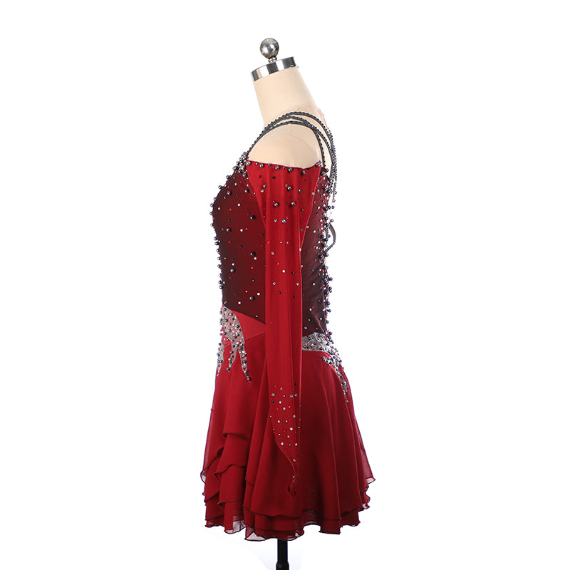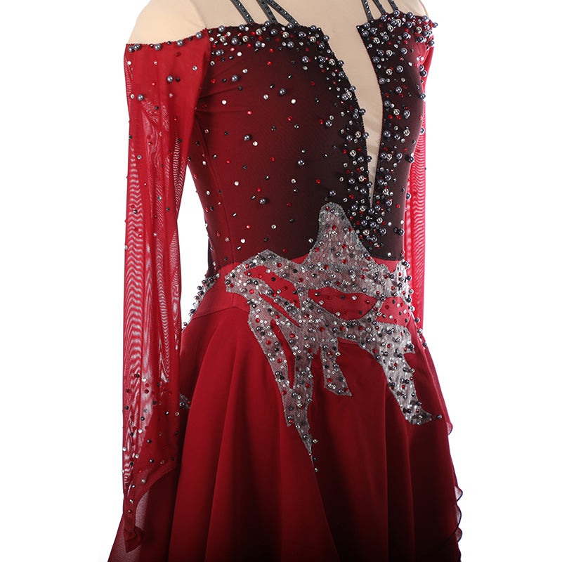 ❤ Features:This LIUHUO figure skating dress is in rich red. It has an off - shoulder design with crisscross straps, and the bodice is densely studded with sparkling rhinestones. A large, glittering appliqué decorates the waist, paired with sheer, flowing sleeves and a layered skirt, creating an elegant and eye - catching look for skaters.