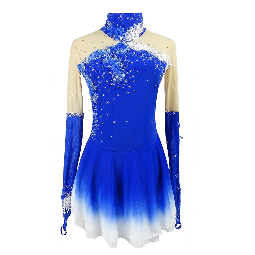 ❤ Features:This LIUHUO figure skating dress is blue - to - white gradient. It has sheer beige sleeves with blue sheer cuffs, a high - neckline with lace and rhinestones. The bodice is decorated with sparkling stones and blue lace appliqués, creating an elegant look for skating.