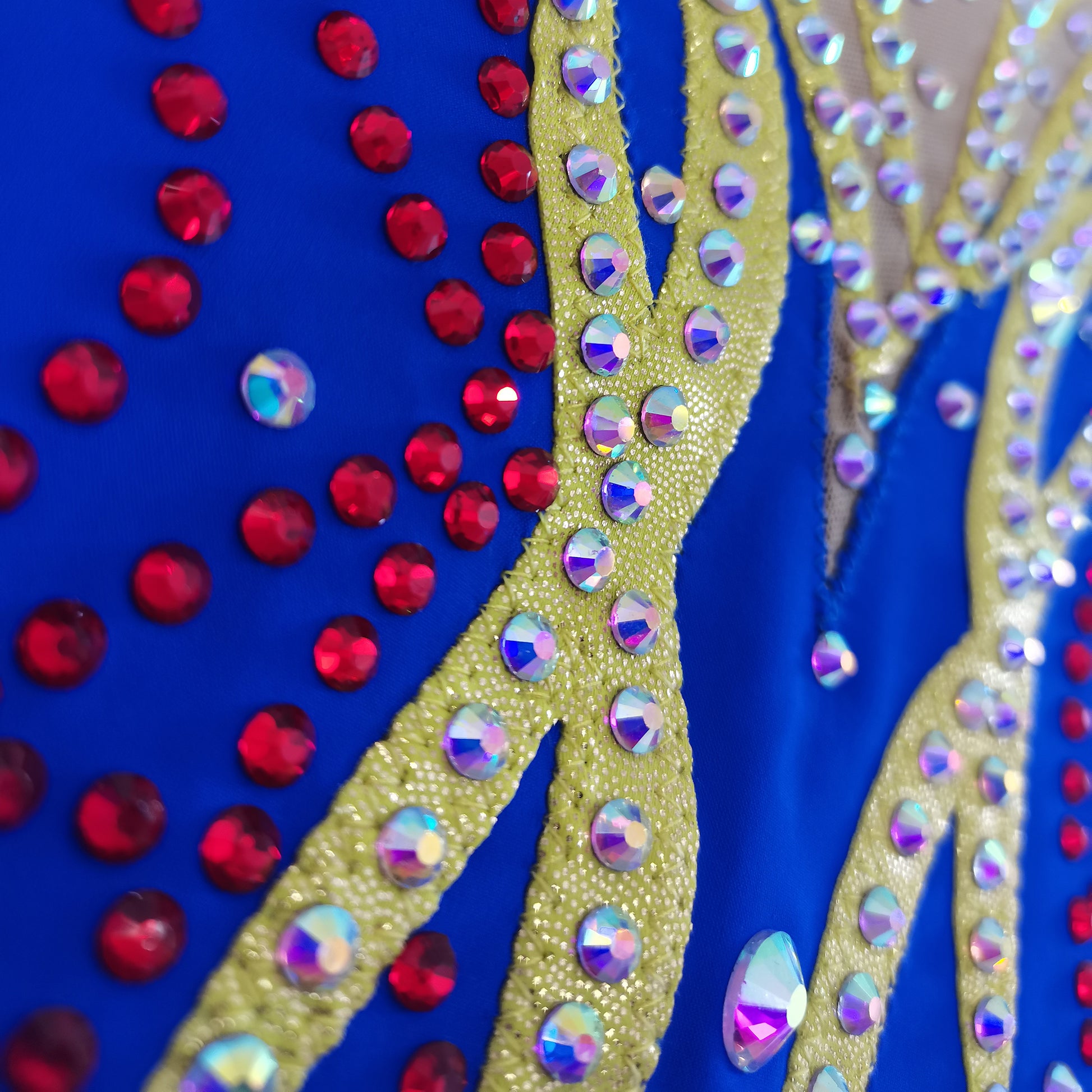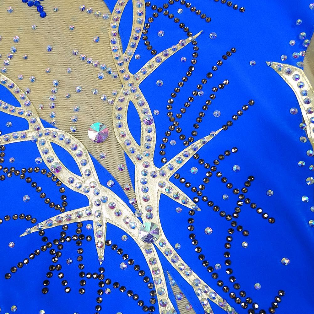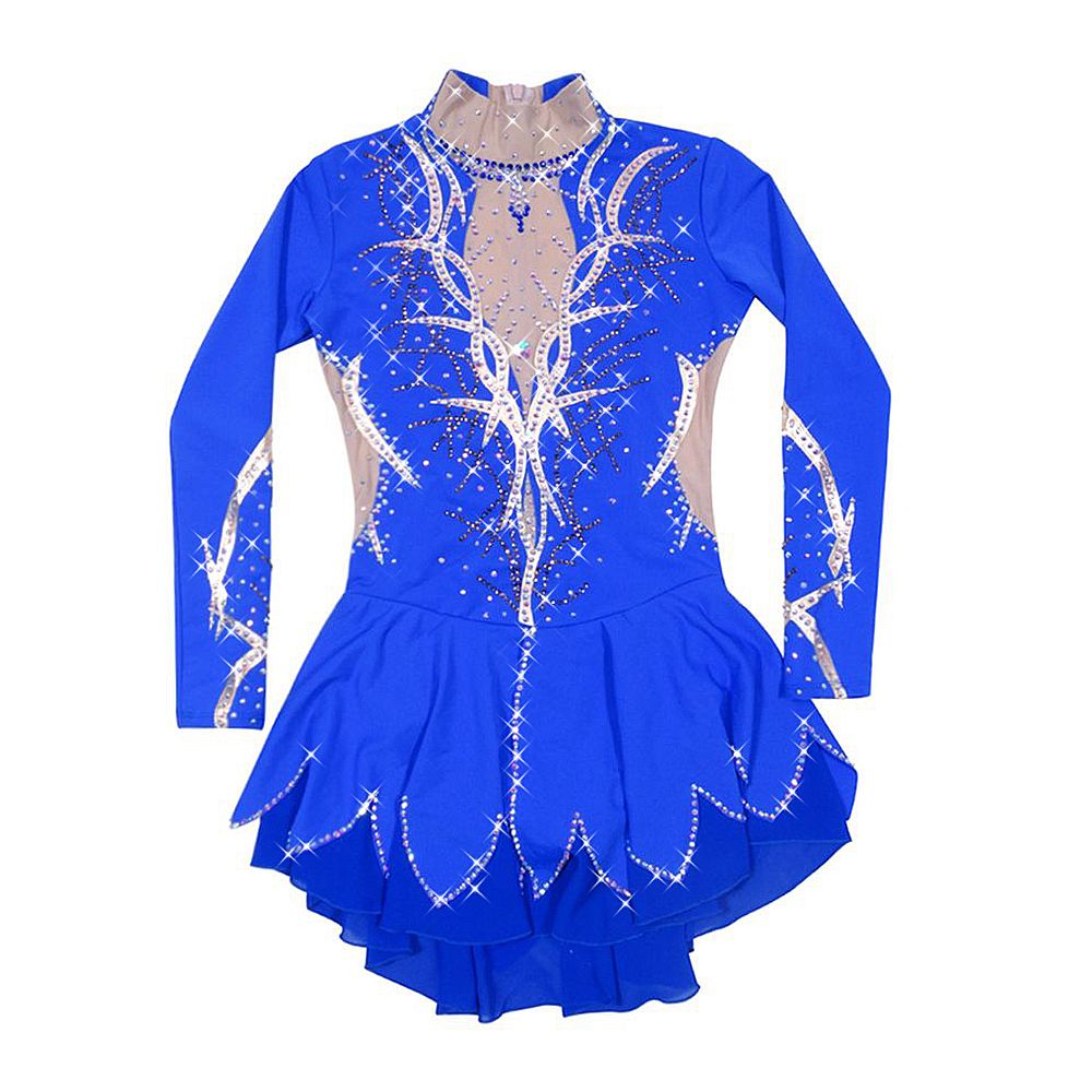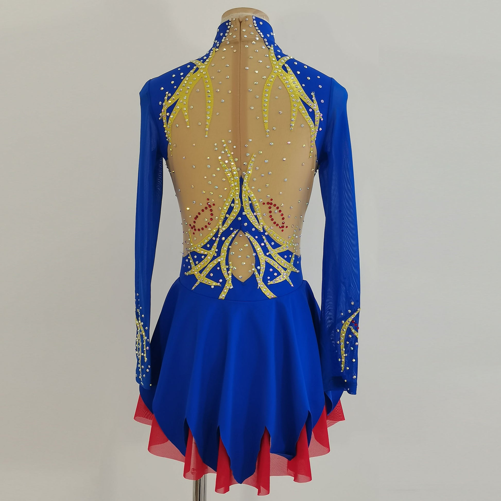 ❤ Features:This LIUHUO figure skating dress features a royal - blue base. It has long sleeves and a high - neck design. The bodice is decorated with golden, vine - like patterns and scattered rhinestones, along with red, branching - line embellishments. The skirt has a unique, layered look with a red inner layer peeking out from the blue outer skirt, creating an eye - catching and elegant style.