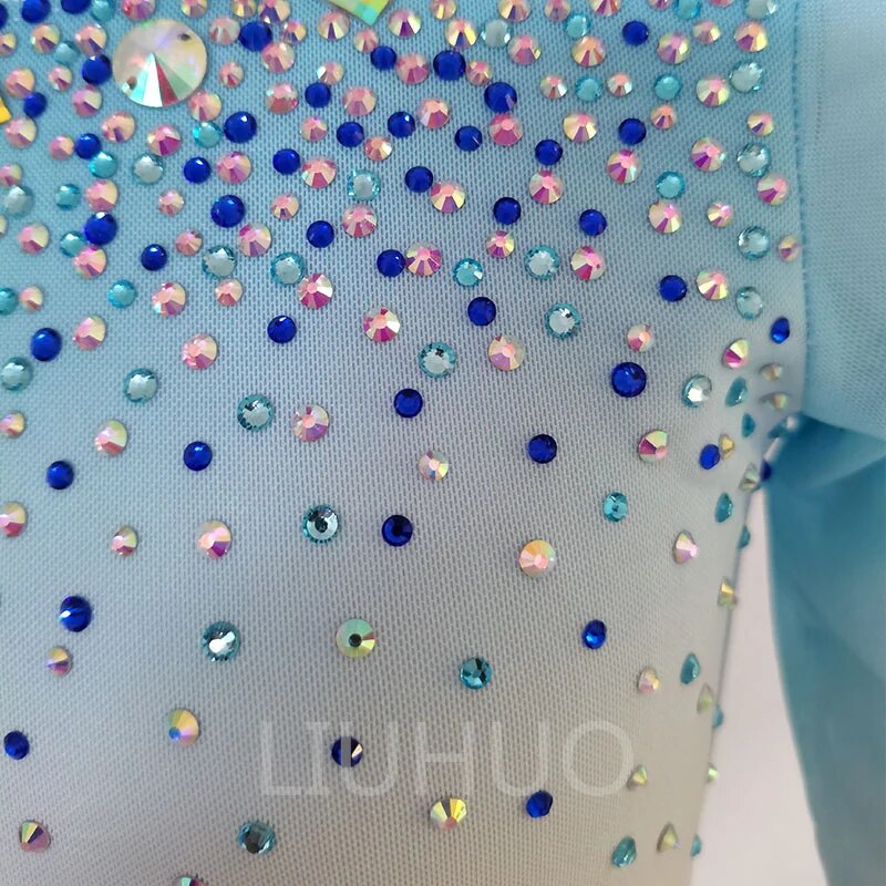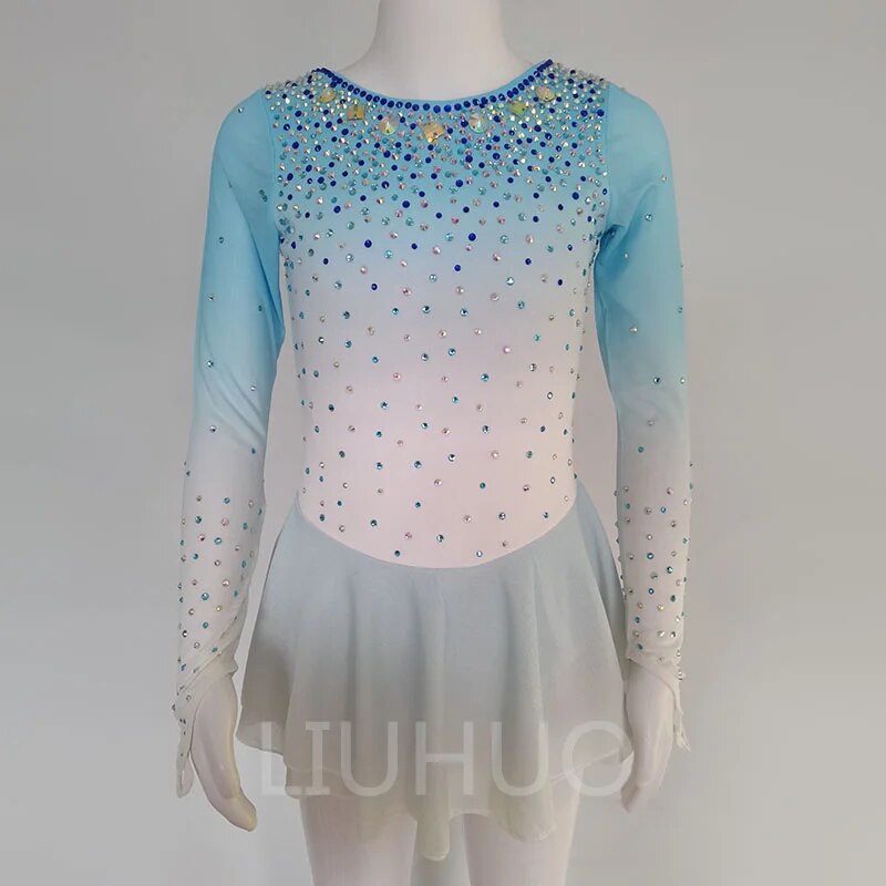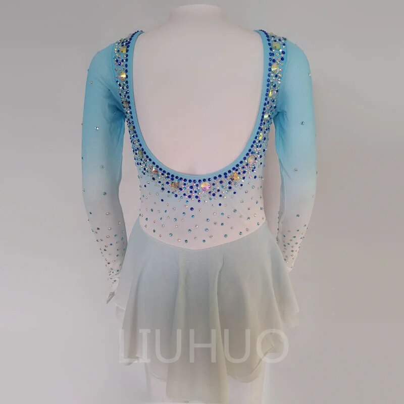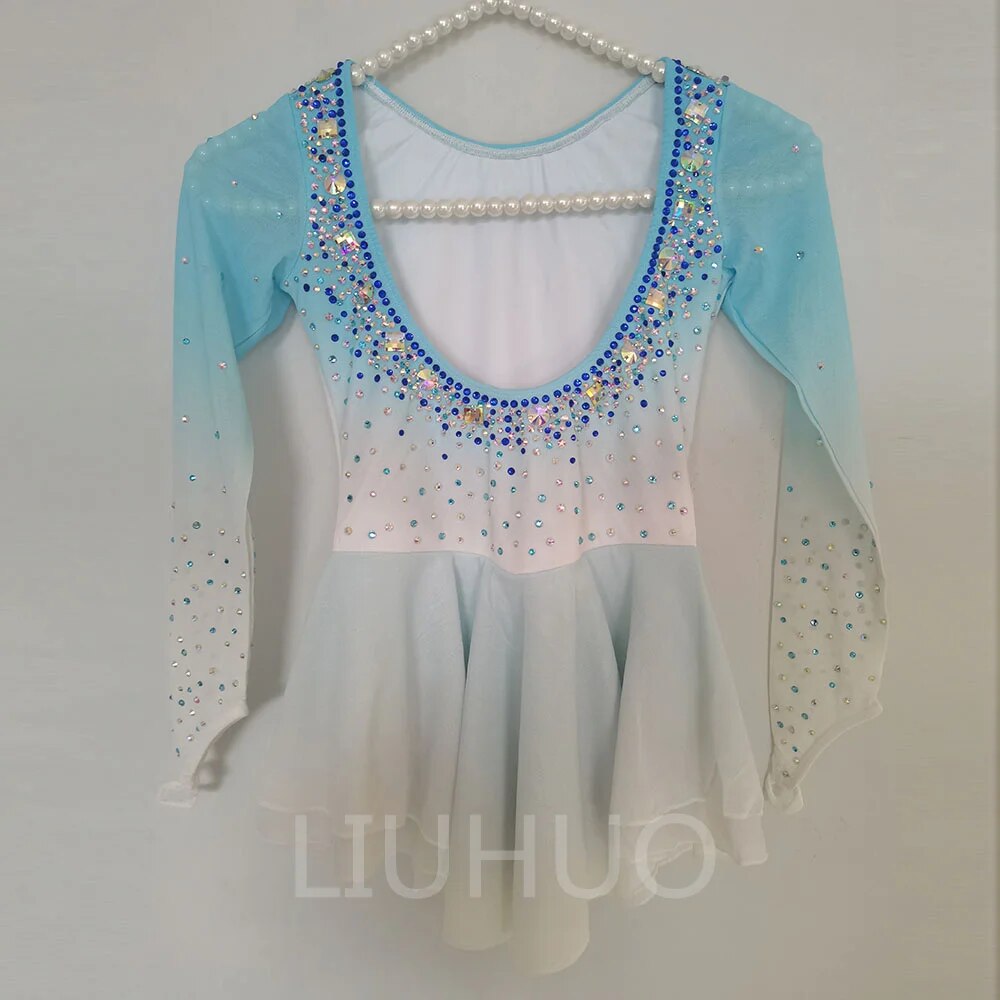 ❤ Features:This is a long - sleeved figure - skating dress. It showcases a soft gradient from light blue to white. The upper part, including the neckline and sleeves, is densely decorated with sparkling rhinestones in various colors, creating a dazzling effect. The flared skirt is made of flowing fabric, complementing the overall elegant and graceful look, making it suitable for figure - skating performances. It can be customized for both children and adults, as is common with many figure - skating costumes.
