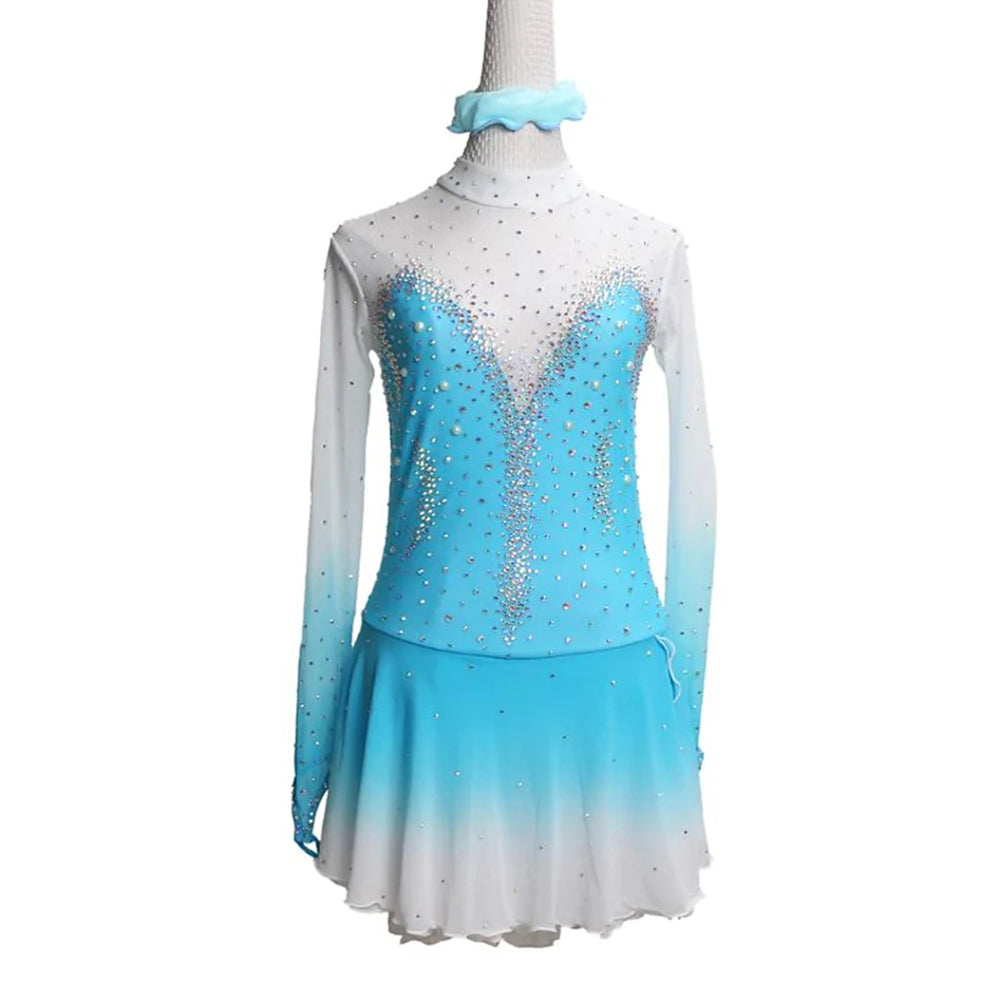 ❤ Features:This is a figure skating dress. It shows a blue - white gradient color as a whole. It has long sleeves and a light blue decoration at the high neckline. The dress is heavily inlaid with shiny rhinestones, and the skirt is light and graceful. It is suitable for women or girls to wear during figure skating performances.