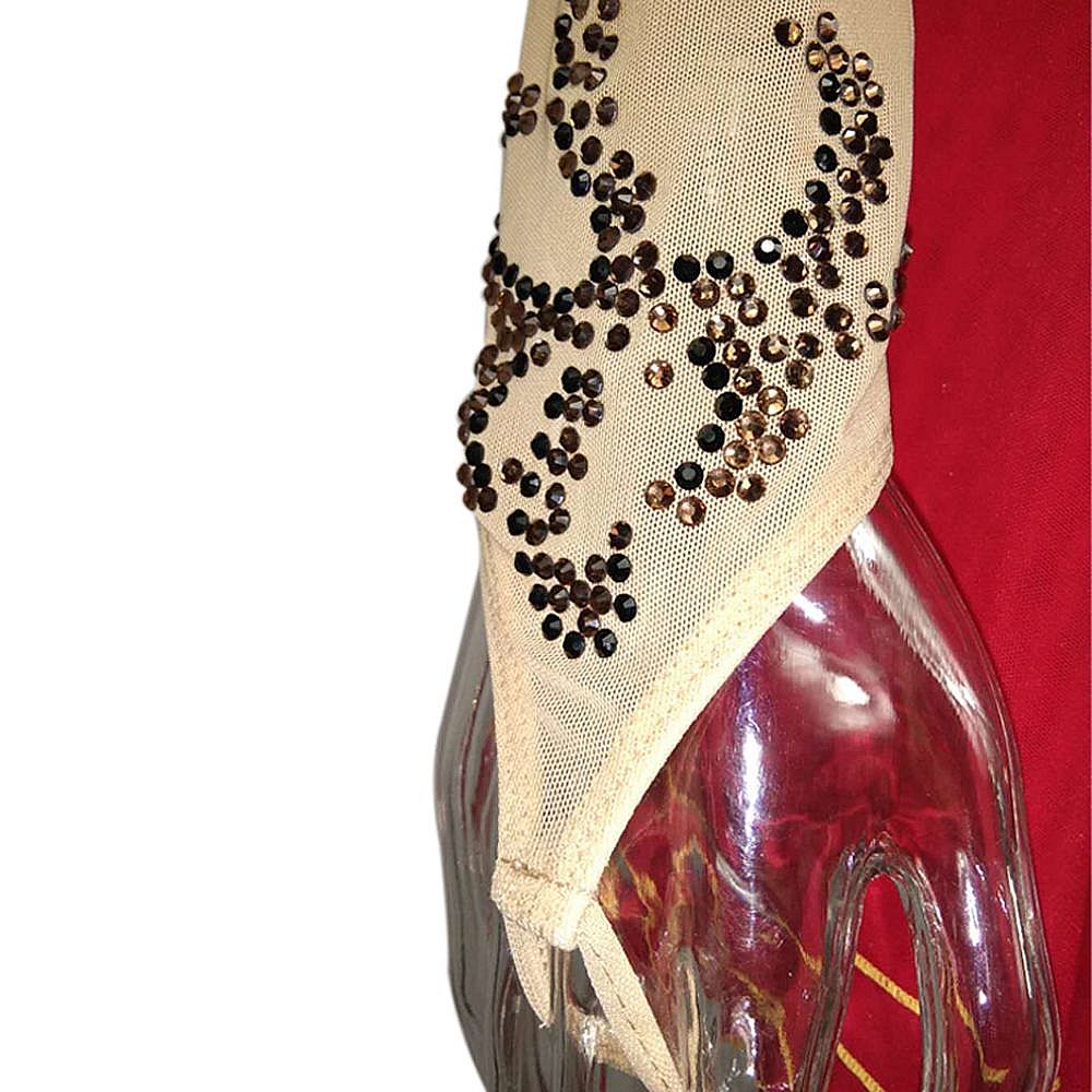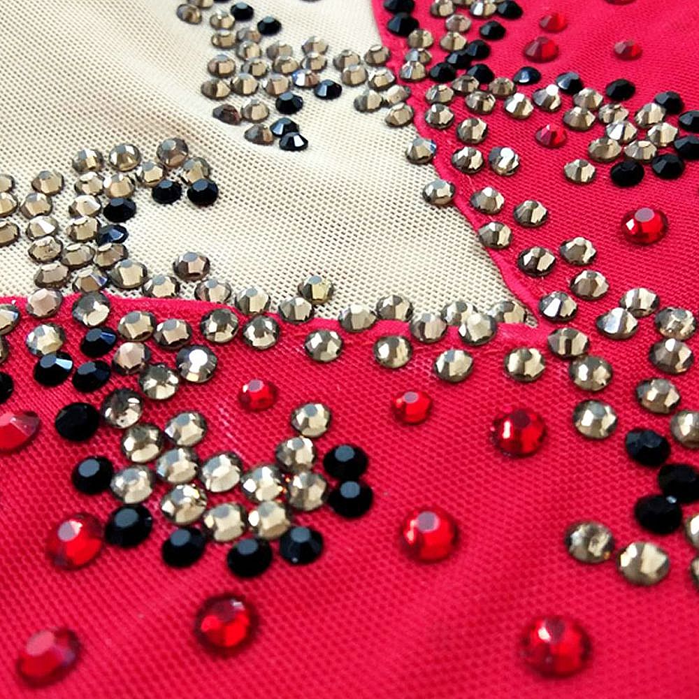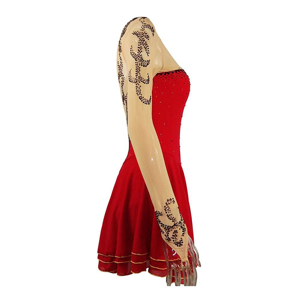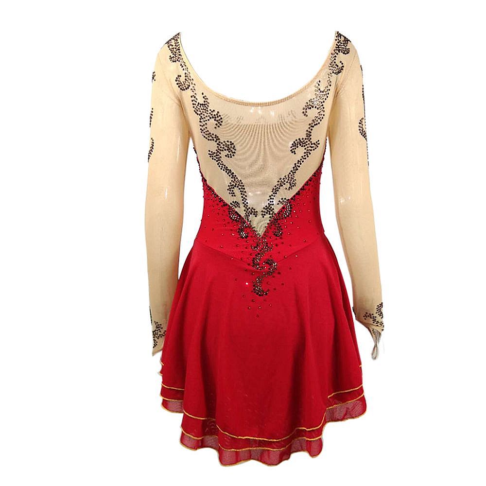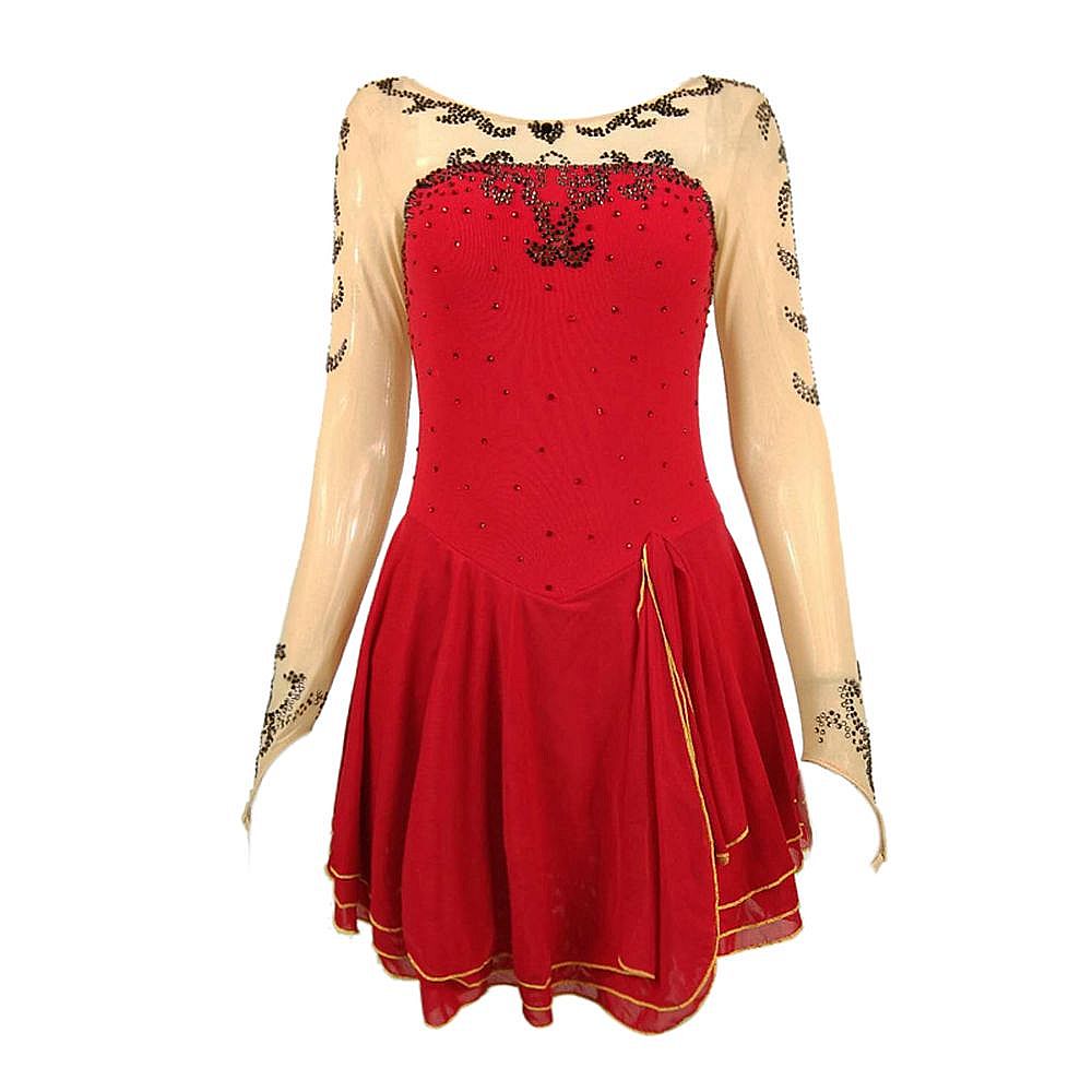 ❤ Features:This LIUHUO figure - skating dress features sheer long sleeves with black rhinestone patterns, a vibrant red bodice dotted with small studs, and a flared skirt trimmed with gold piping. It blends elegance and sporty flair, ideal for women and girls in skating performances.