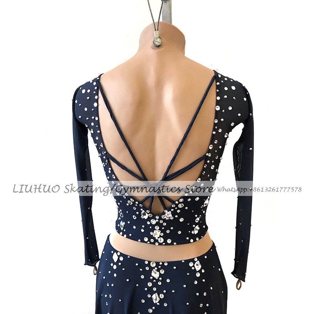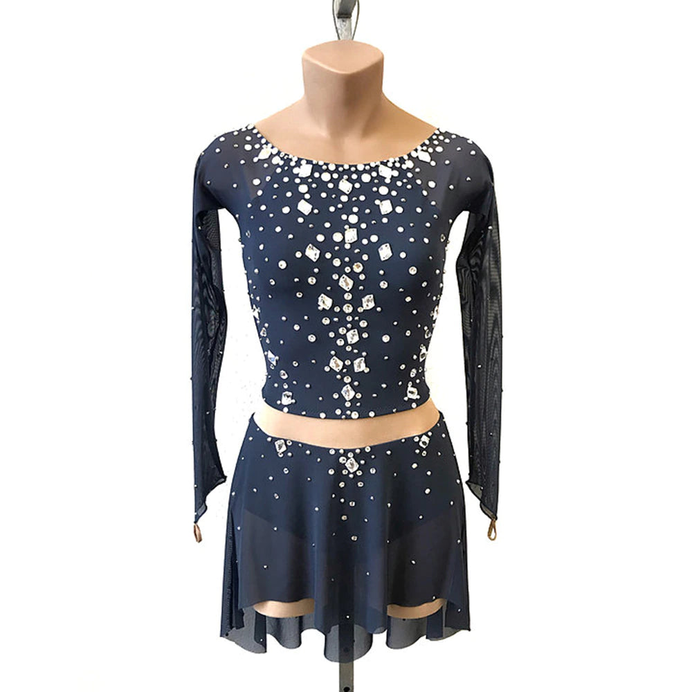 ❤ Features:This is LIUHUO's figure skating dress. The main body is dark blue. The top is a cropped, navel - baring style with a boat - shaped neckline, fully decorated with rhinestones and sequins, and the sleeves are made of mesh material. The bottom is a short skirt, also adorned with rhinestones. The whole dress is gorgeous and exquisite, suitable for figure skating performances.