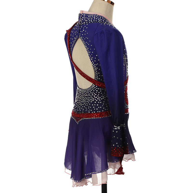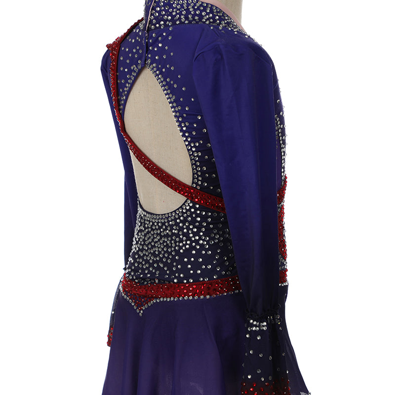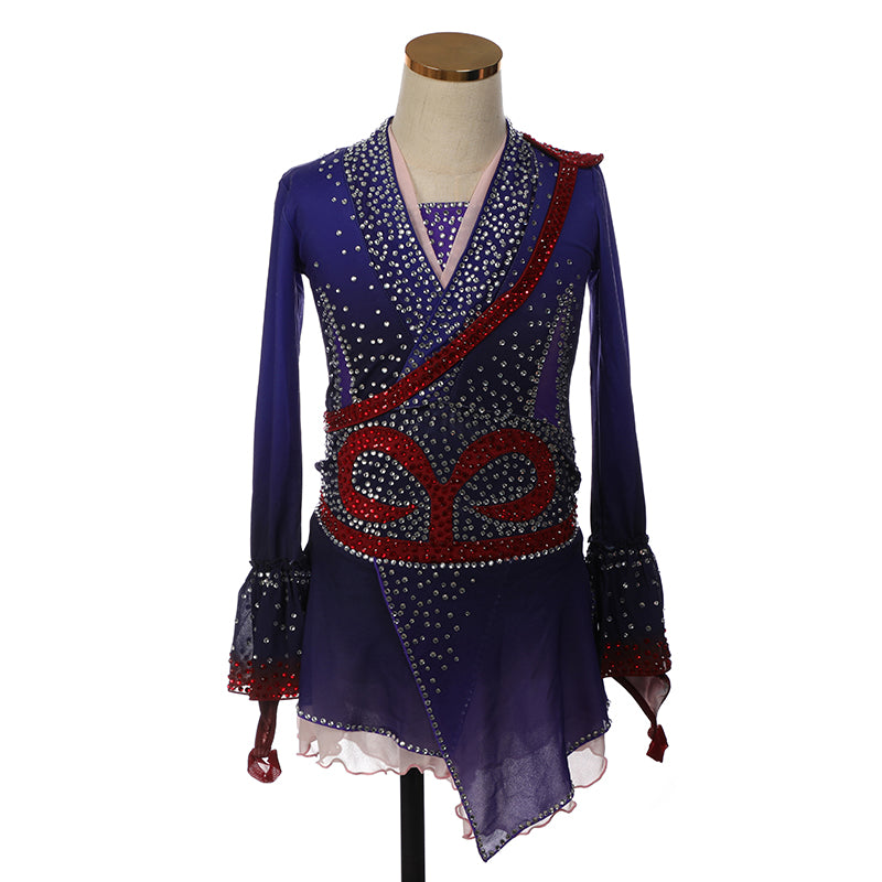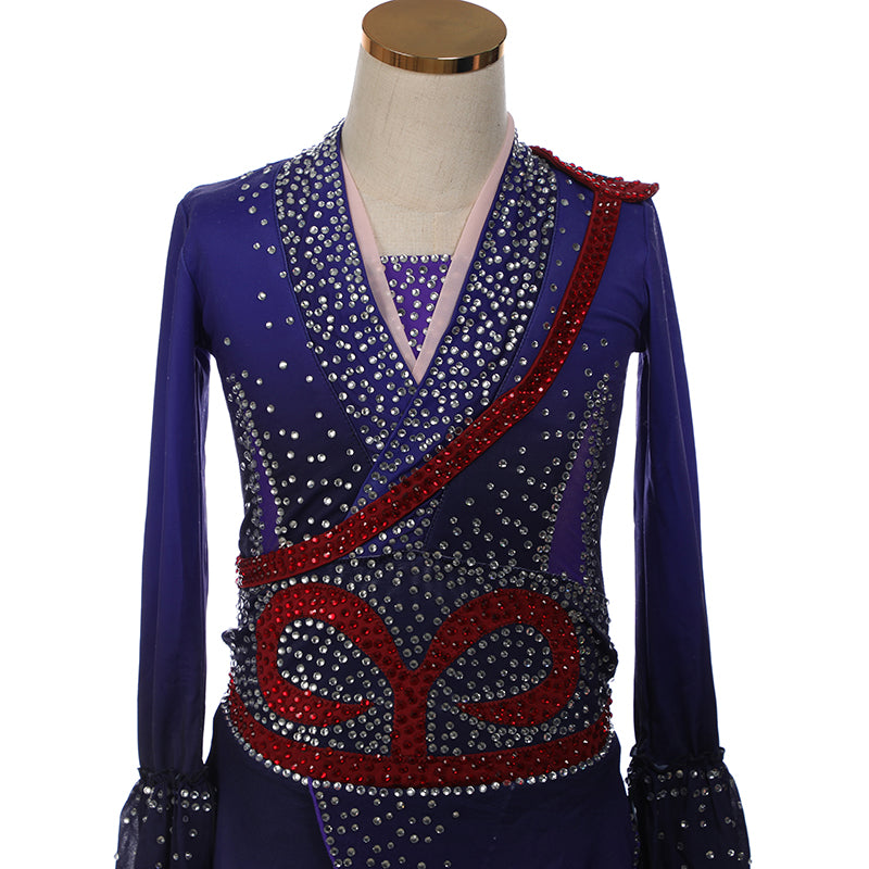 ❤ Features:This LIUHUO figure skating dress features a deep purple base color. It has a V - neck design, and is lavishly adorned with numerous sparkling rhinestones. There's a red decorative strap crossing diagonally, and a distinctive red rhinestone - encrusted pattern at the waist. The long sleeves have flared cuffs, adding a touch of elegance and charm to the overall look.
