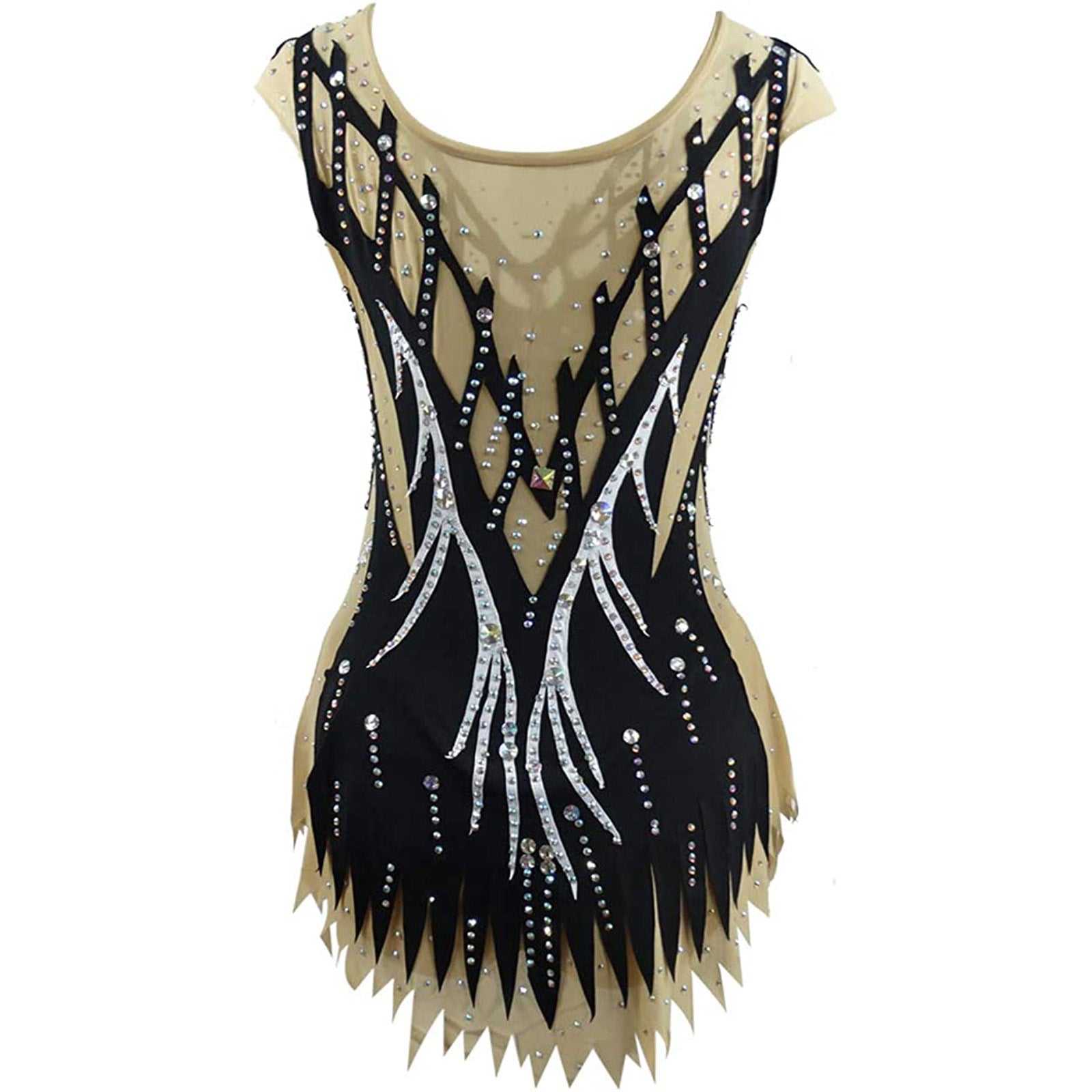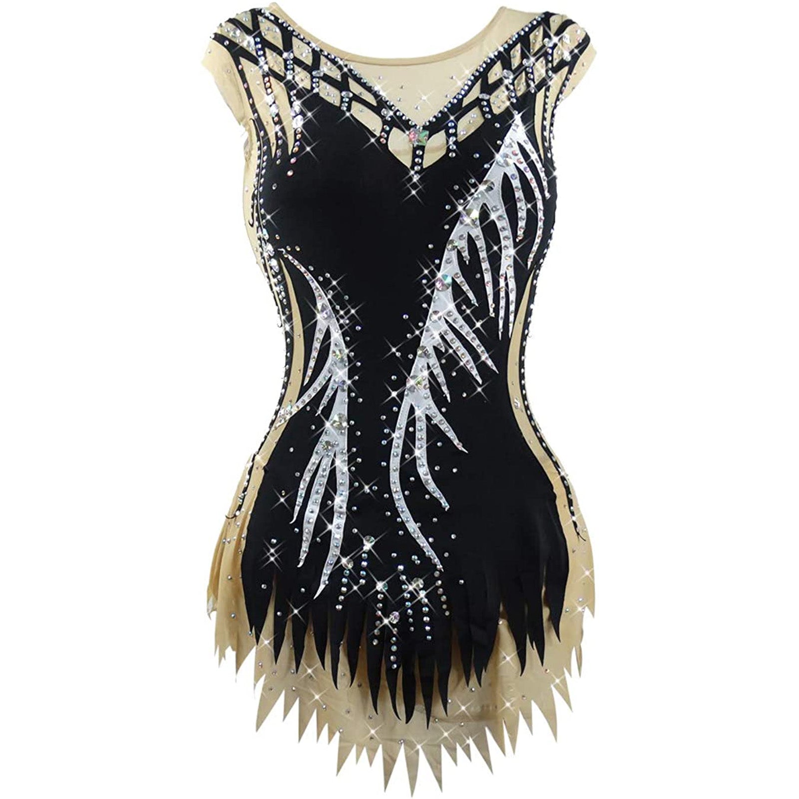 ❤ Features: This LIUHUO rhythmic gymnastics leotard showcases a black main body with beige accents. It features an elaborate design of silver, feather - like patterns adorned with numerous sparkling rhinestones. The unique, layered and jagged hem adds a dynamic touch, and the cut - out details on the upper part enhance its elegance, making it suitable for rhythmic gymnastics performances.
