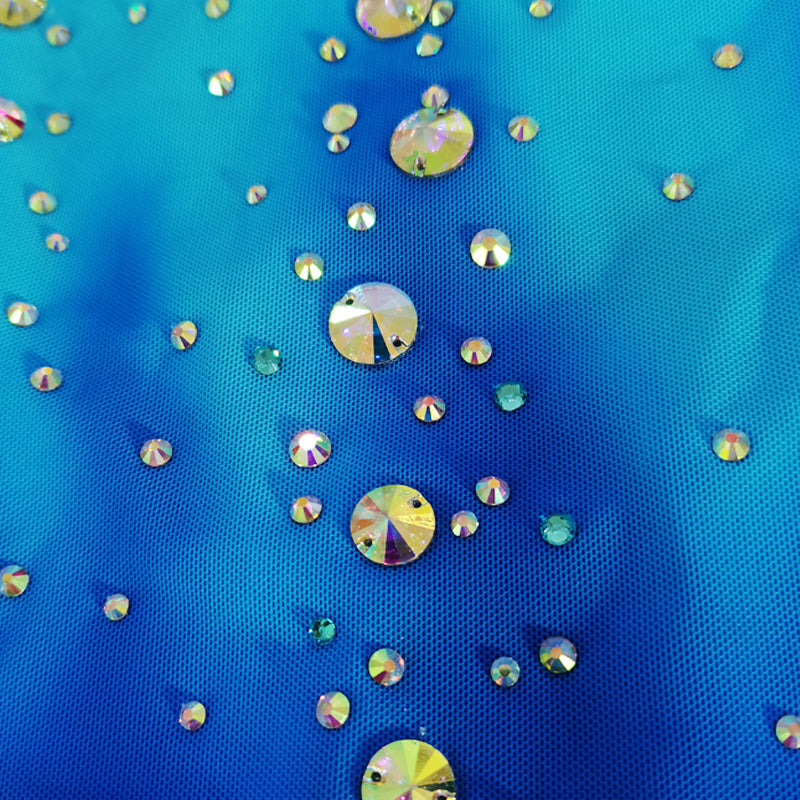 The dress was made by high quality spandex,with plenty of diamonds and  gem of acrylic. Mostly we sell the dress with crystals of  the Middle East.