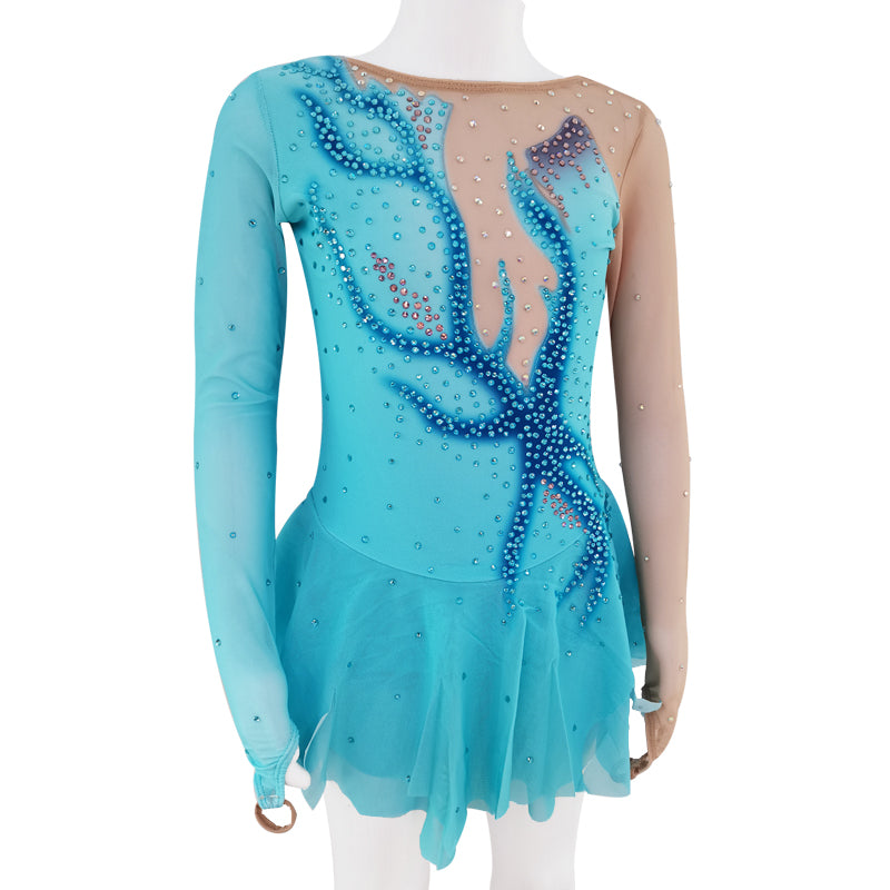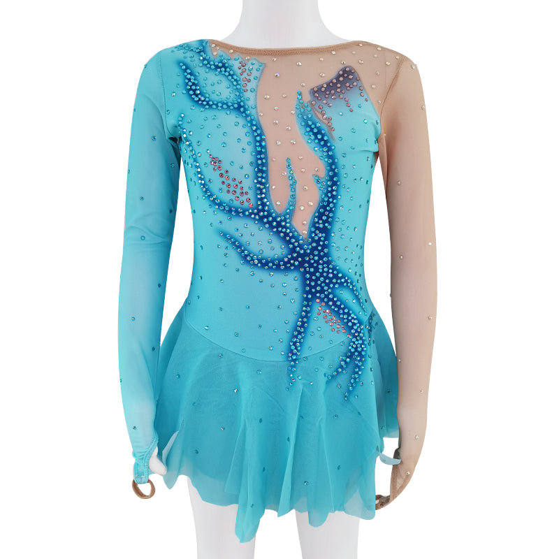 ❤ Features:This LIUHUO skating dress is a harmonious blend of elegance and creativity. It features long sleeves, with one sleeve in a sheer, light - beige fabric that contrasts with the main body. The dress is predominantly a soft turquoise color, adorned with numerous sparkling rhinestones.