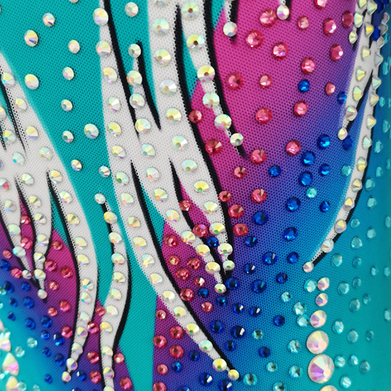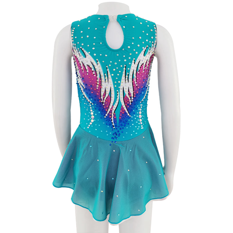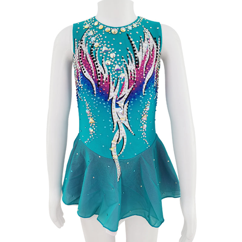 The main part of the dress is adorned with numerous sparkling rhinestones, forming a colorful pattern. Purple, pink, white, and turquoise are intertwined, just like a dreamy underwater world. A circle of delicate rhinestones encircles the neckline, further enhancing its luxurious feel. The skirt is made of light - weight chiffon, presenting a natural gradient effect. As the wearer moves, it sways gracefully and fluidly, adding a unique charm to the figure - skating performance. Whether under the lights of the ice rink or on the competition stage, it is sure to be a show - stopper.