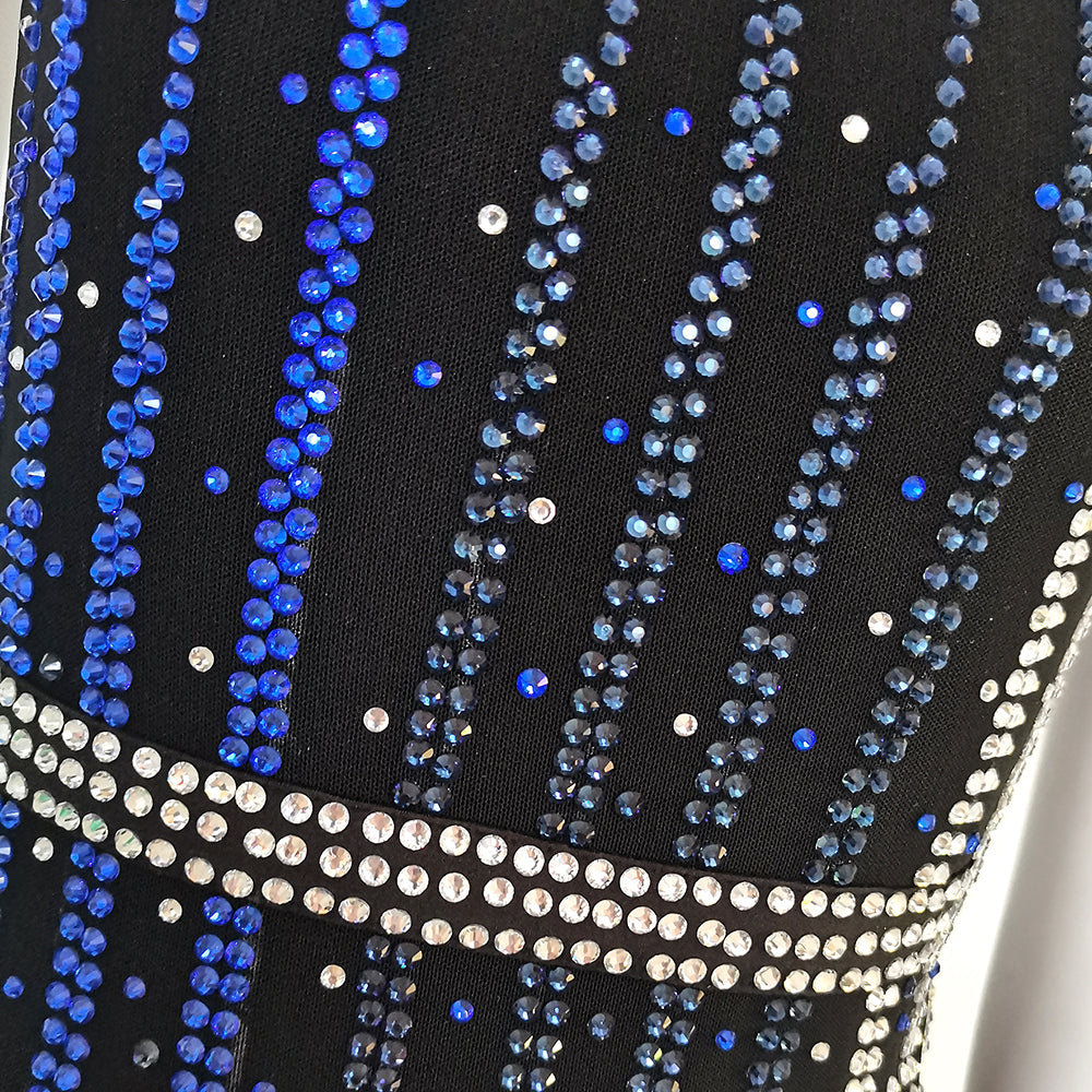 The dress is adorned with sparkling rhinestones in striking patterns. White and blue rhinestones create vertical lines that seem to cascade down the bodice, giving a sense of movement and dynamism. A band of rhinestones encircles the waist, accentuating the silhouette.
