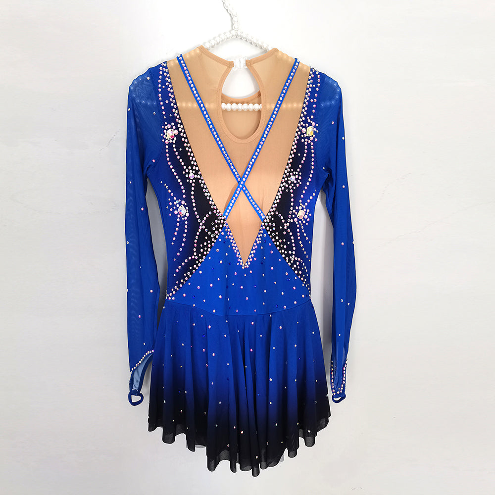 ❤ Features:This LIUHUO figure - skating dress is a captivating ensemble. Dominated by a rich blue hue with a gradient effect from dark to light blue, it exudes elegance. The long - sleeved design features sheer fabric, adding a delicate touch.