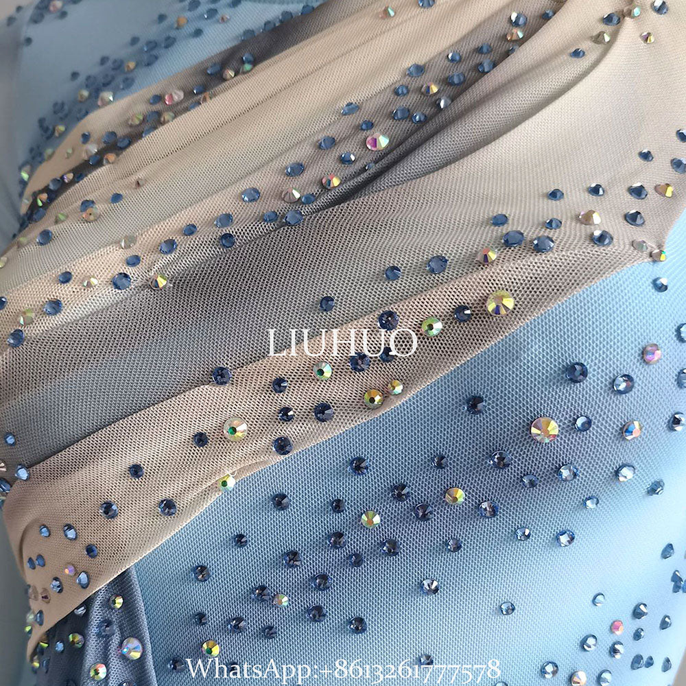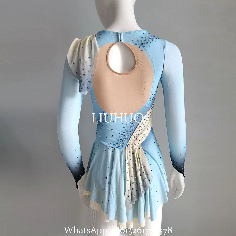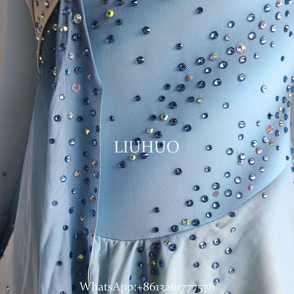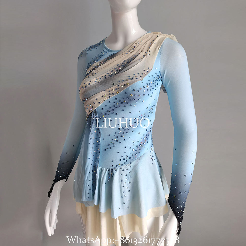 ❤ Features:This LIUHUO figure - skating dress is a captivating blend of elegance and sparkle. With its soft light - blue base, it exudes a tranquil charm. The long, sheer sleeves add a delicate and graceful touch. Diagonal beige stripes intricately cross the bodice, lavishly embellished with countless rhinestones that shimmer and shine, creating a dazzling effect. The multi - layered skirt, in light blue and beige, flows gracefully, allowing for unrestricted movement. This dress, with its harmonious color palette and meticulous detailing, is perfect for skaters aiming to make a memorable impression on the ice.