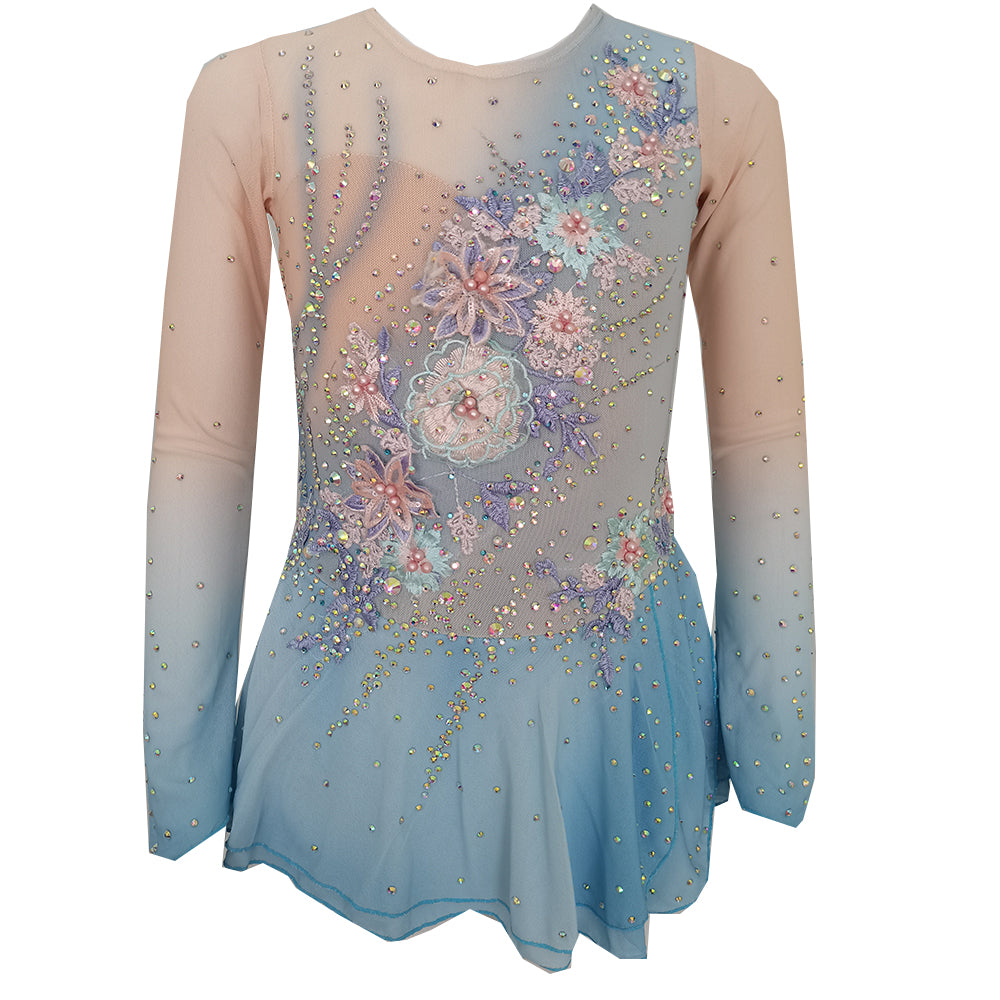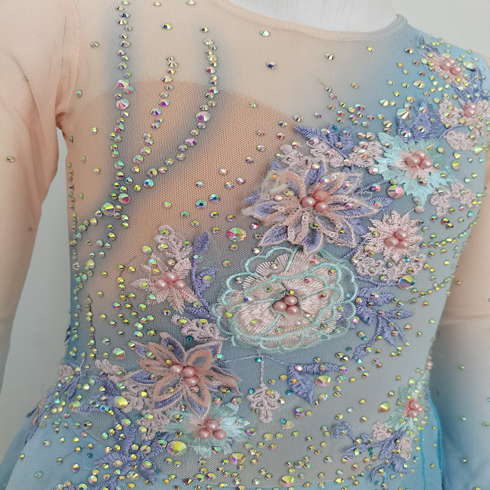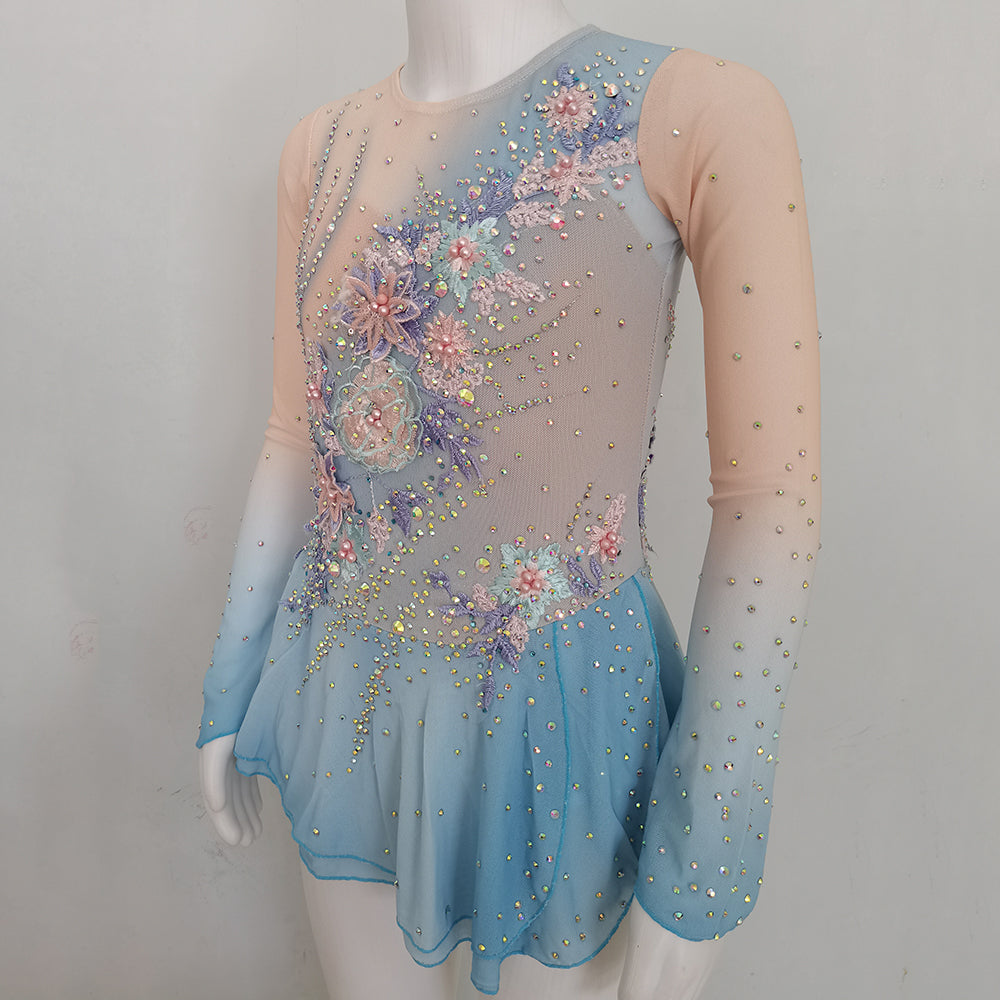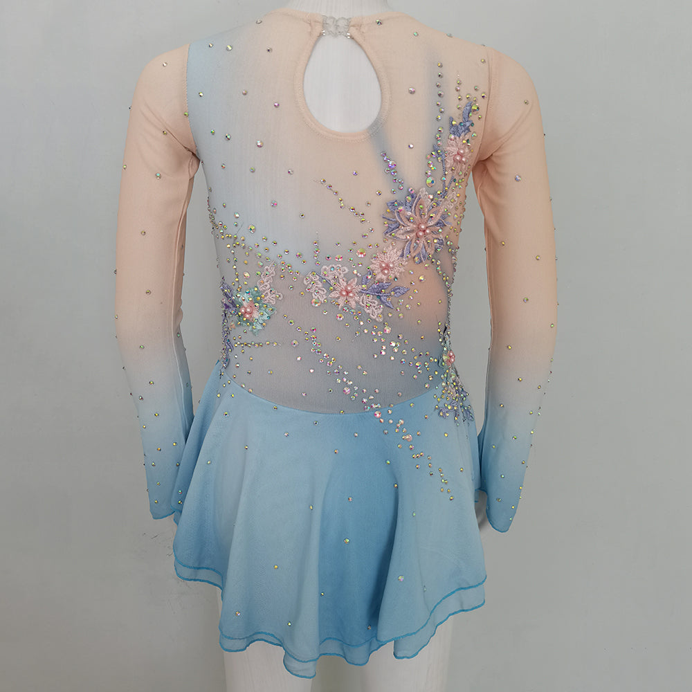 ❤ Features:This LIUHUO skating dress is a masterpiece of elegance and charm. It features a beautiful gradient from light pink to light blue, creating a soft and dreamy visual effect. The long - sleeved design is adorned with delicate floral embroidery in pastel colors, complemented by numerous sparkling rhinestones that add a touch of glamour. The back has a tasteful oval cut - out, enhancing the overall allure. This dress combines aesthetic appeal with functionality, making it ideal for figure skaters.