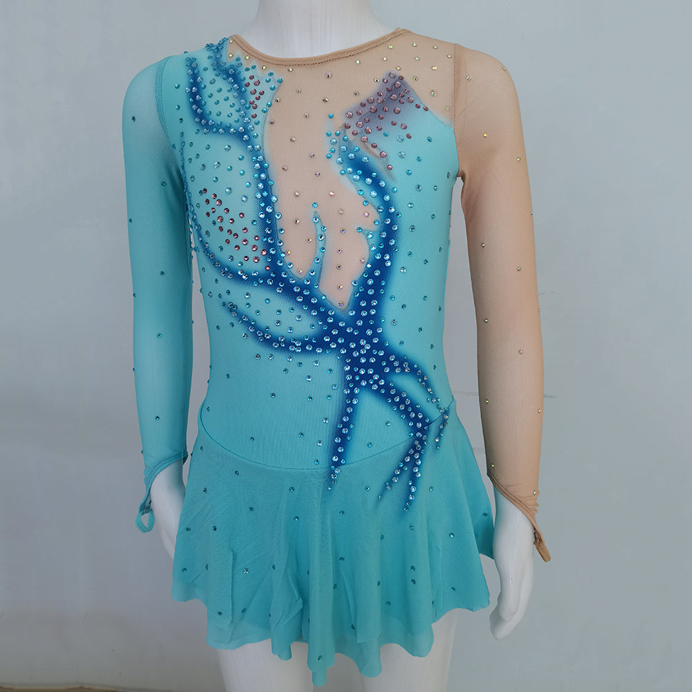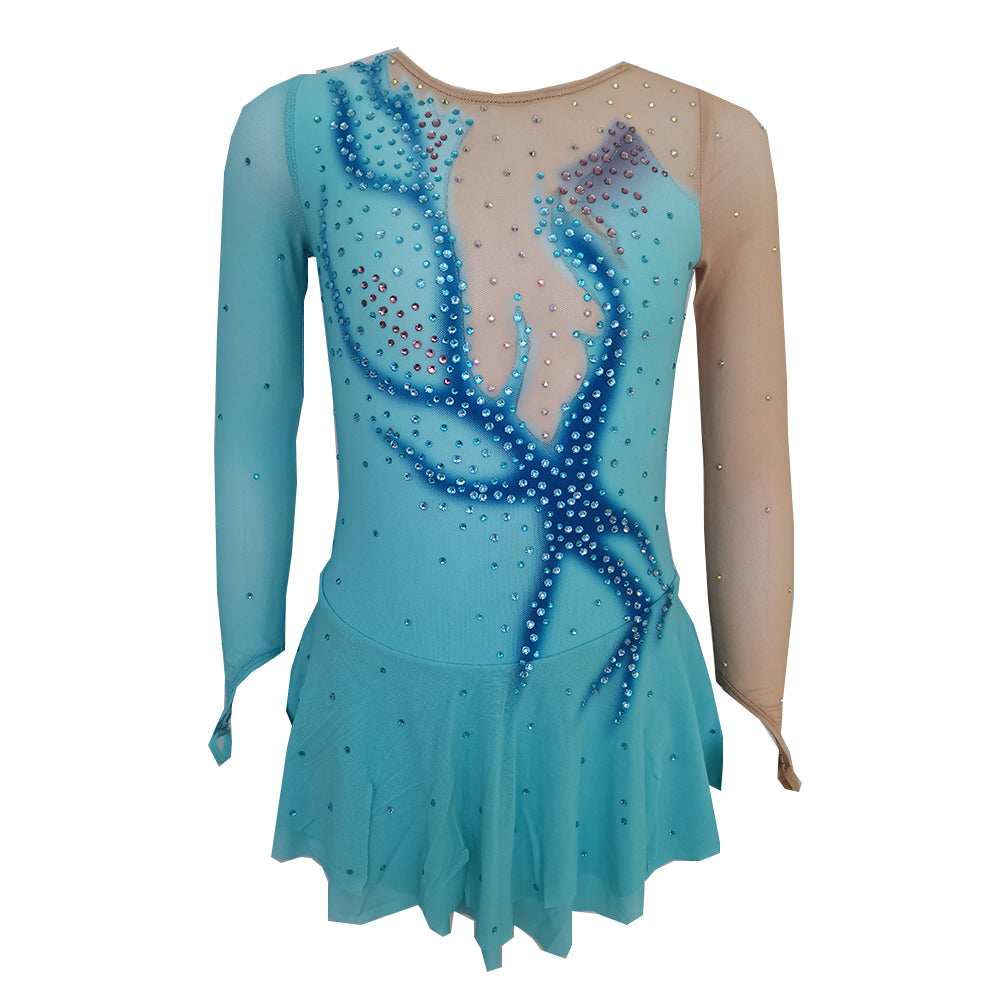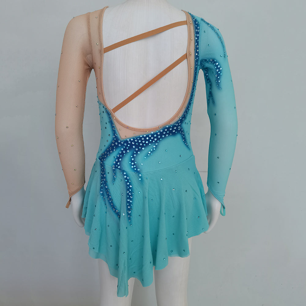 ❤ Features:This LIUHUO skating dress is a blend of grace and style. It has a light turquoise base color with a gradient effect. The front features a unique blue pattern, intricately decorated with numerous rhinestones, creating a sparkling visual impact. The sheer sleeves, one in a matching turquoise and the other in a nude tone, are also dotted with rhinestones. The back showcases an open - back design with criss - crossing straps, adding an element of allure. It's a perfect choice for skaters aiming to stand out on the ice.