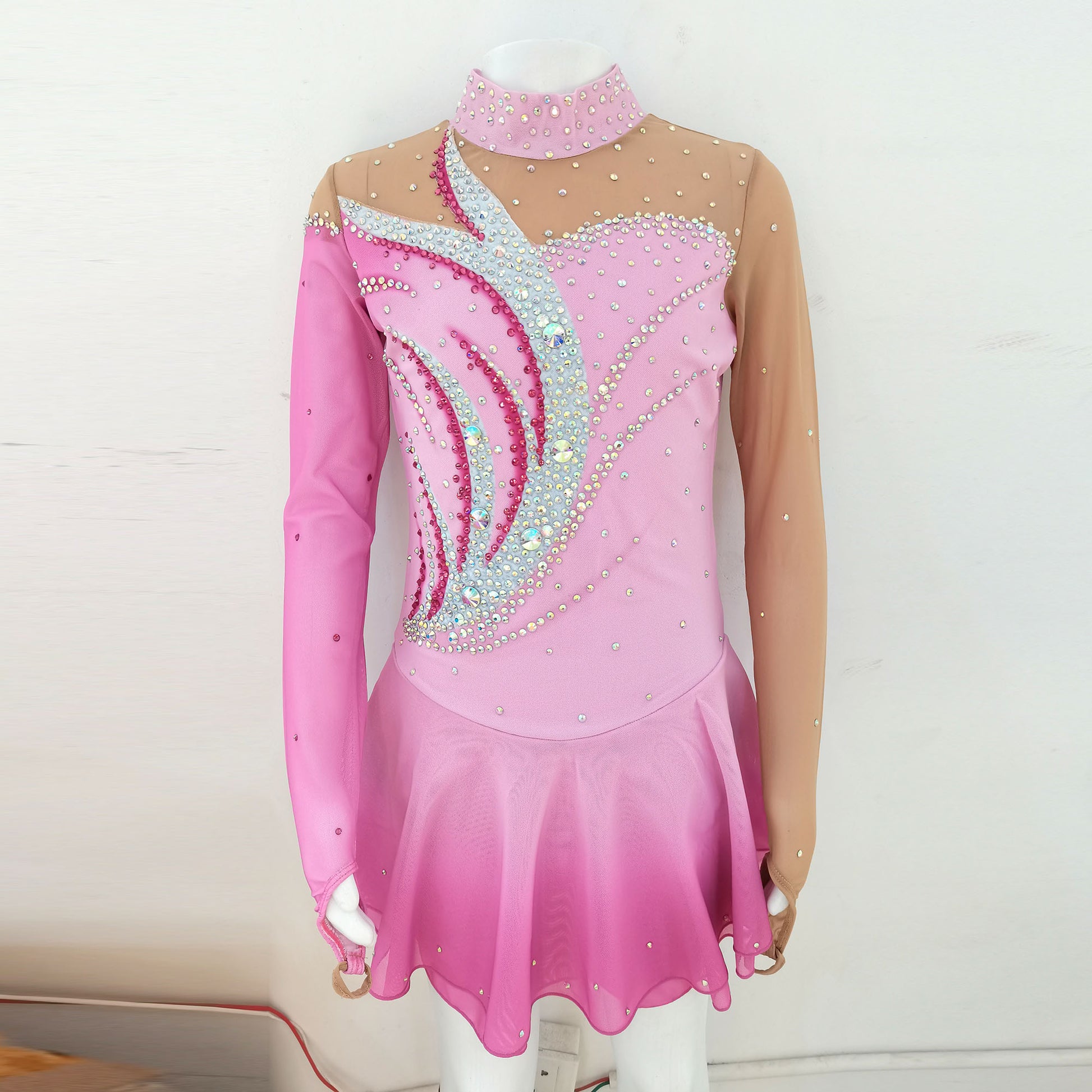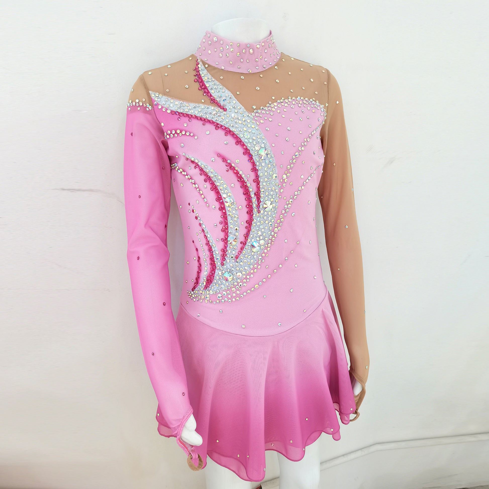 ❤ Features:This LIUHUO skating dress is a charming and eye - catching piece. It boasts a soft pink gradient color scheme, transitioning from a lighter shade at the top to a deeper one towards the flared skirt. The high - necked sheer part and one long sleeve are adorned with an array of sparkling rhinestones, which are artistically arranged in flowing patterns that combine shades of pink and light blue. This design not only adds a touch of glamour but also allows skaters to shine brightly on the ice.