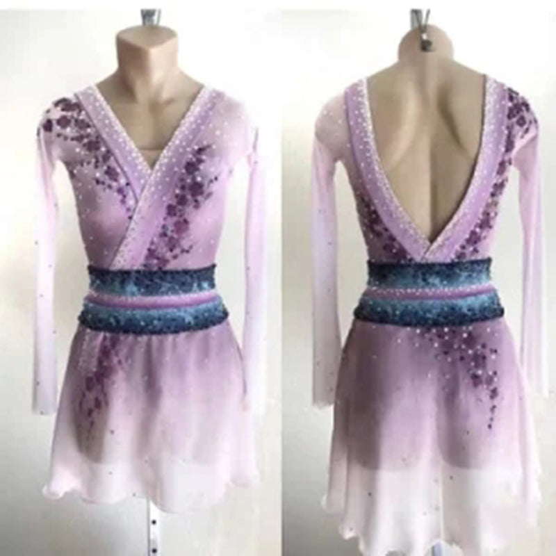 ❤ Features:This LIUHUO figure skating dress exudes elegance and charm. It features a soft gradient from light to deeper purple, creating a dreamy visual effect. The V - neck in the front and the deep V - back design add a touch of allure. Long sleeves are adorned with delicate rhinestones that embellish the purple patterns, enhancing its beauty. The waist is accentuated by a band with a combination of blue and purple hues, also decorated with sparkling elements. The flared skirt gives it a graceful silhouette, making it a perfect choice for skaters to showcase their style on the ice.