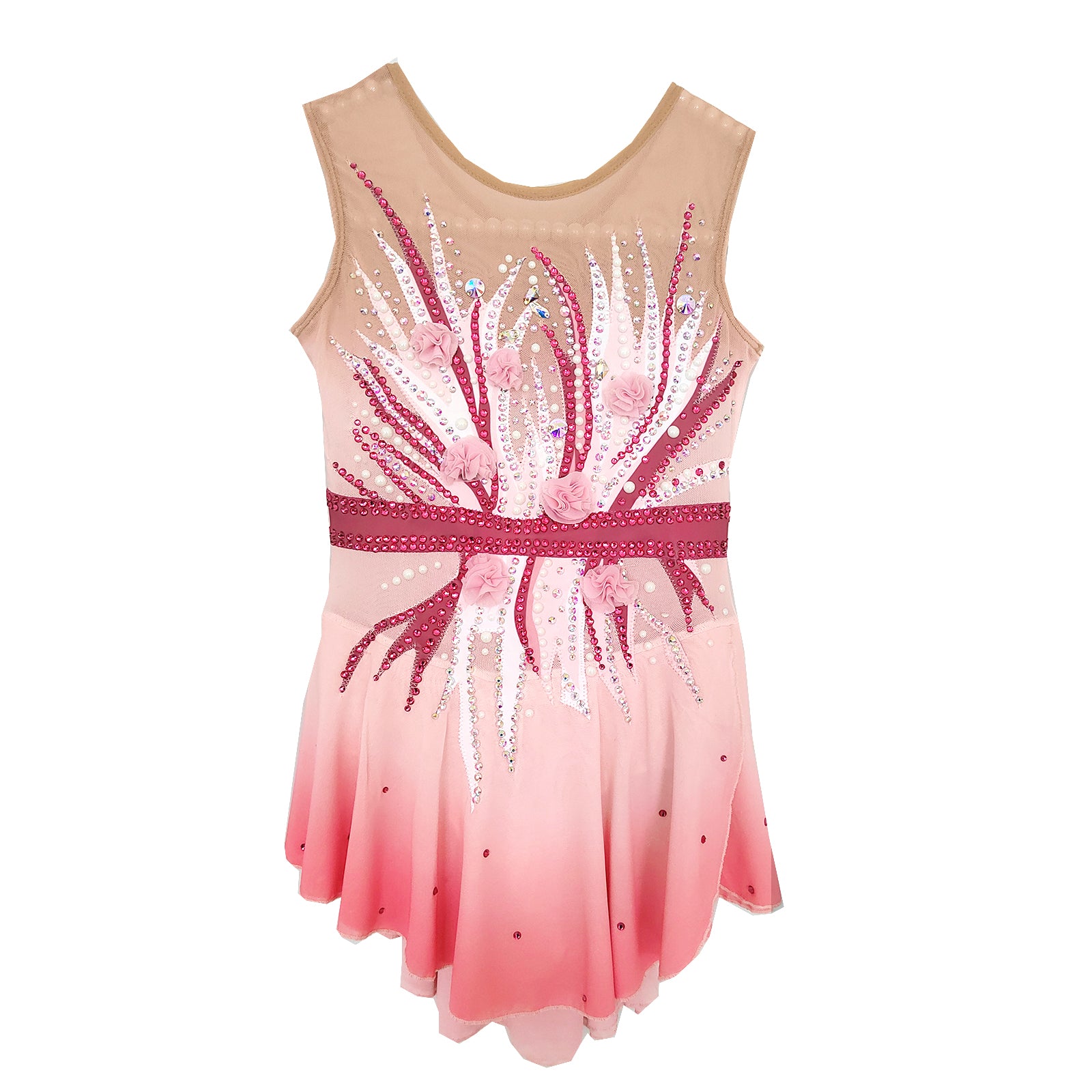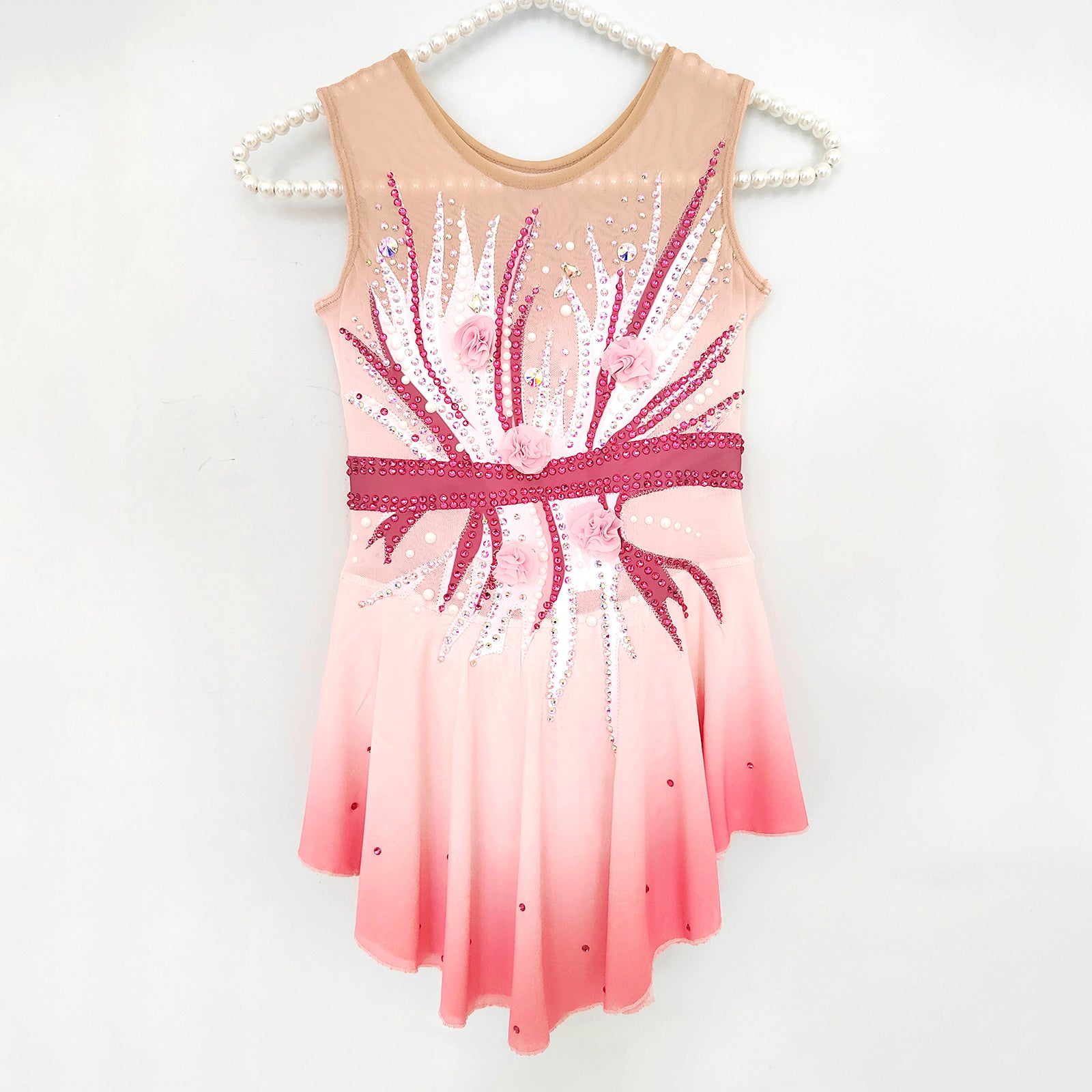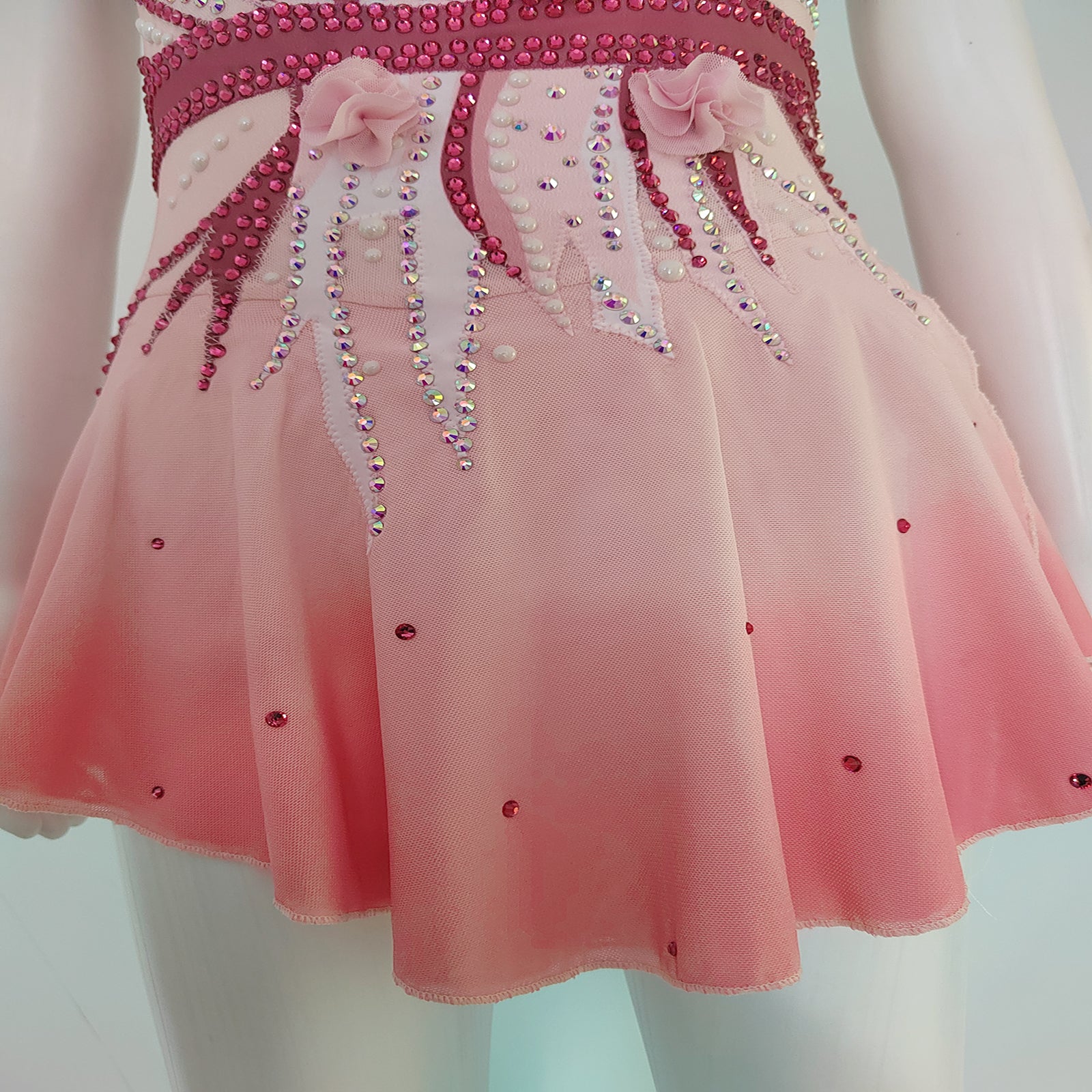 ❤ Features:This LIUHUO skating dress is a charming and exquisitely designed piece. It features a soft gradient of pink hues, transitioning from a lighter shade at the top to a deeper one towards the flared skirt. The sleeveless, sheer bodice is adorned with elaborate embellishments, including sparkling rhinestones meticulously arranged in dynamic, radiating patterns. Delicate pink fabric flowers are interspersed among the rhinestones, adding a touch of natural beauty. A pink belt encircles the waist, further accentuating the silhouette. This dress combines grace and sparkle, making it an ideal choice for skaters to stand out on the ice.