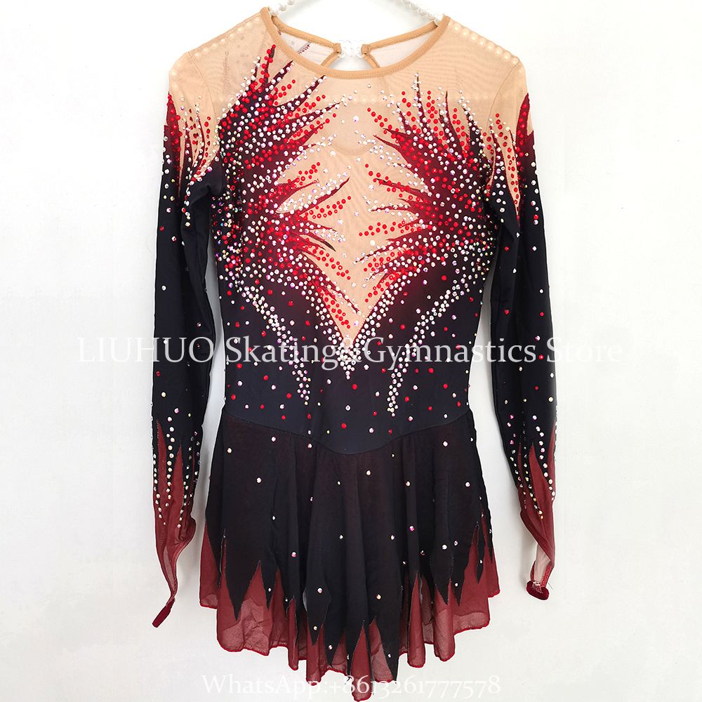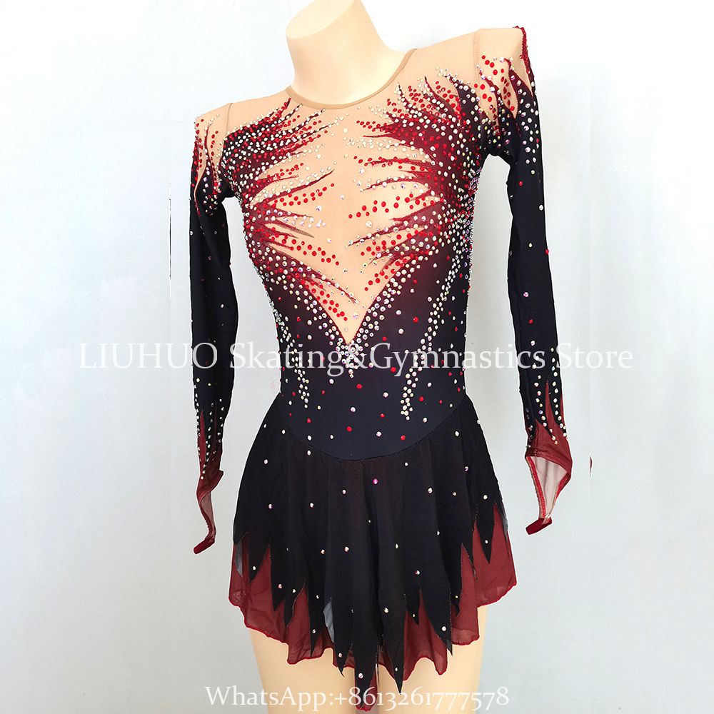 ❤ Features:This LIUHUO figure skating dress is a striking combination of elegance and boldness. The base color is a deep black, which provides a striking contrast to the vivid red and sparkling rhinestones. The sheer panels on the upper body and sleeves are intricately adorned with an array of rhinestones, creating dynamic, flame - like patterns that add a sense of movement and energy. The long sleeves and the hem of the flared skirt feature a gradient effect from black to red, enhancing the visual appeal. This dress is not only a fashion statement but also allows skaters to make a powerful impression on the ice.