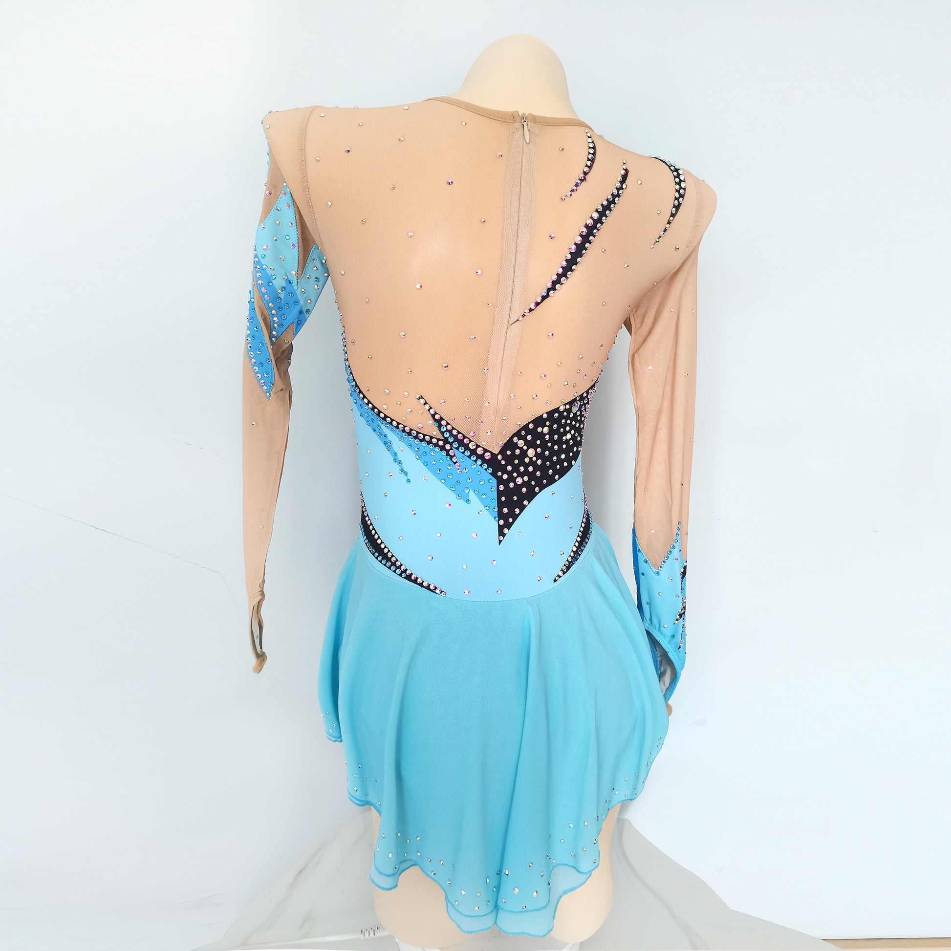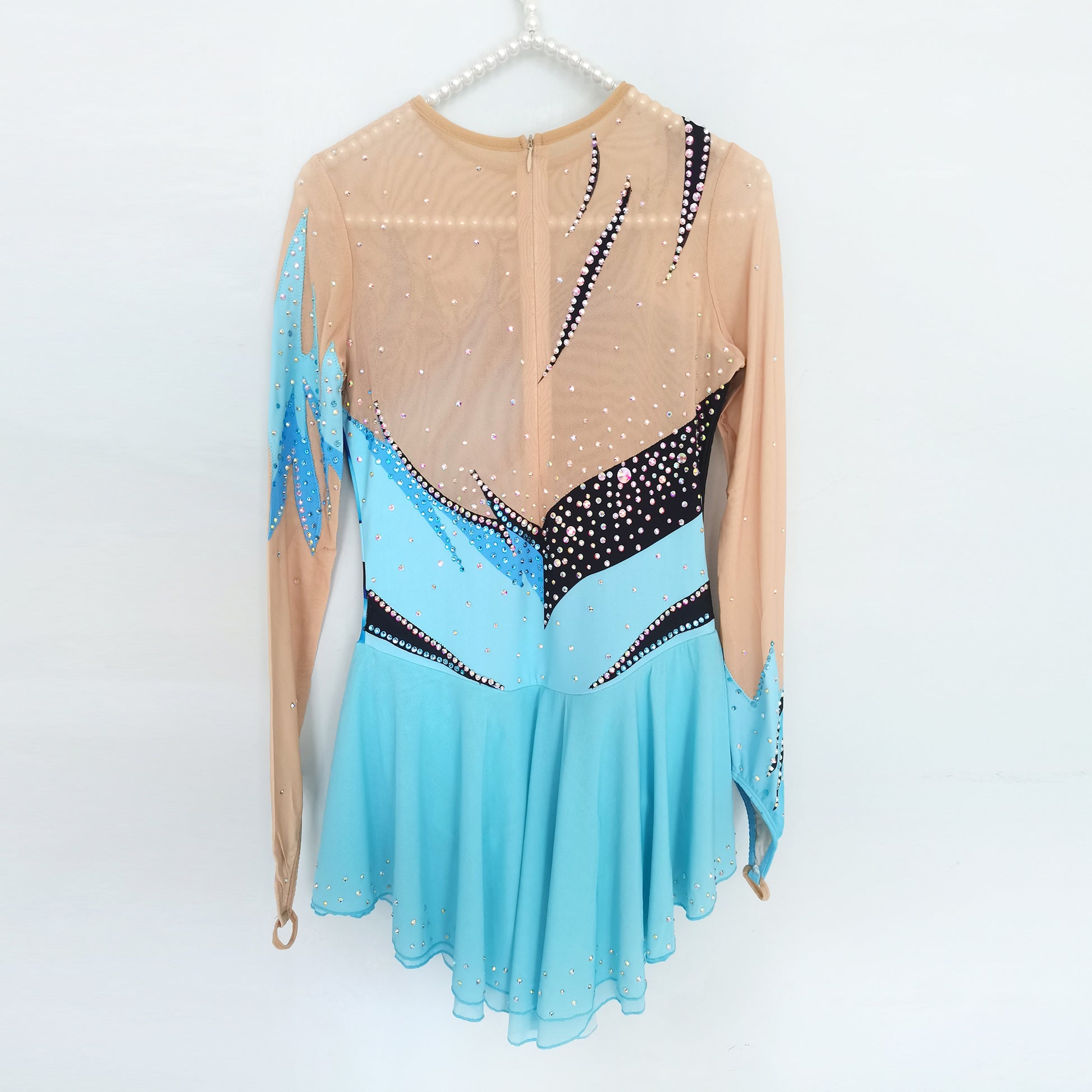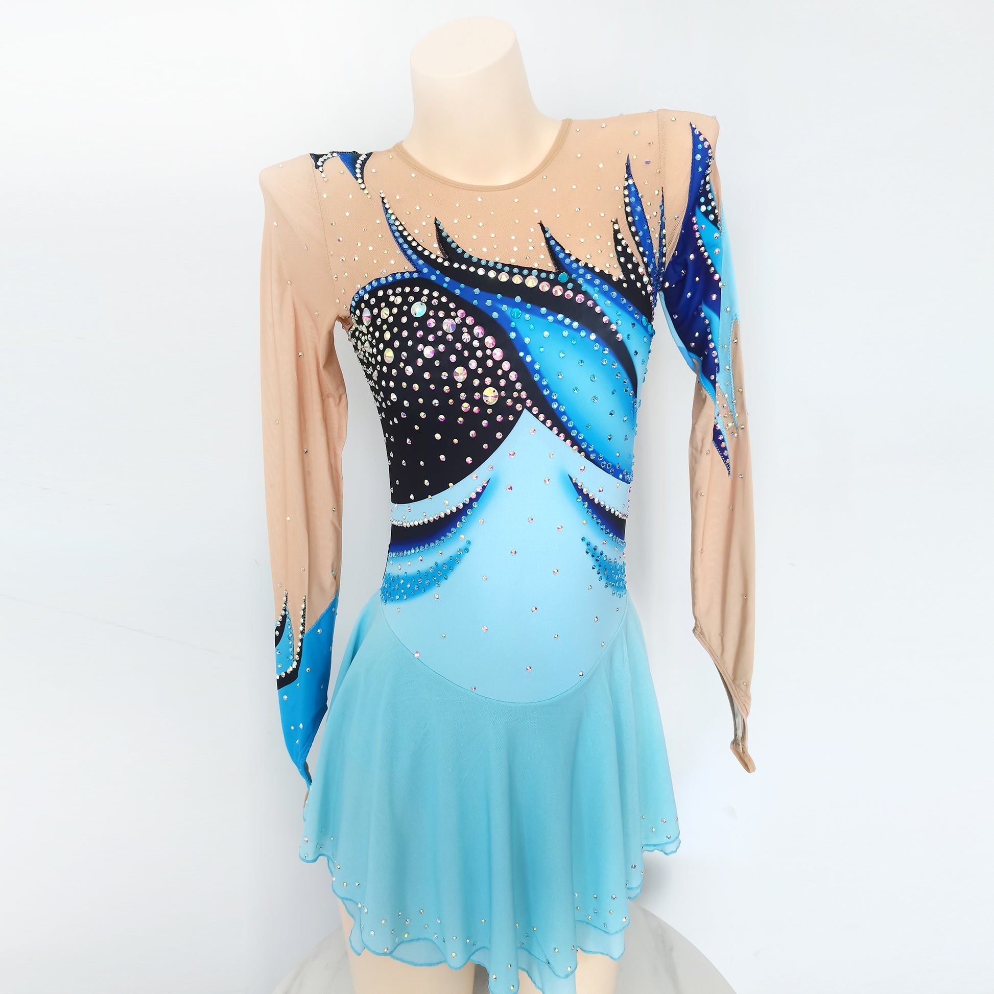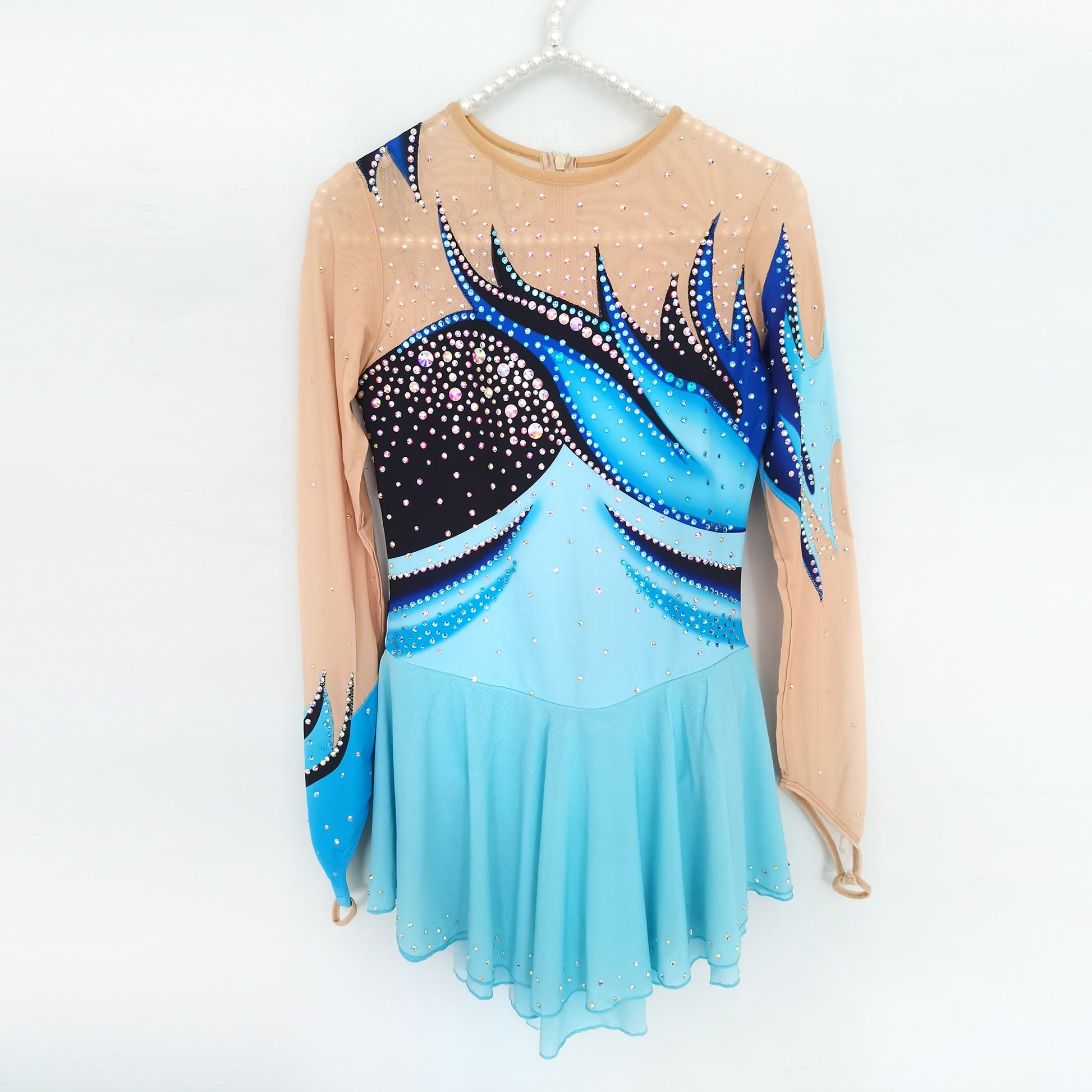 ❤ Features:This LIUHUO figure skating dress is a visually - striking masterpiece. It combines a soft beige on the sleeves and upper part with a vibrant blue gradient on the skirt. The design features bold, artistic patterns with deep blue and black accents that resemble flowing waves or flames, adding a dynamic feel. Adorned with numerous sparkling rhinestones meticulously placed along the patterns, the dress catches the light and creates a dazzling effect. The flared skirt allows for easy movement, making it not only a stylish choice but also highly functional for figure skaters.