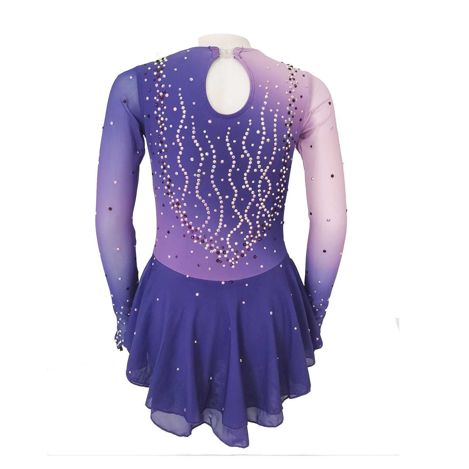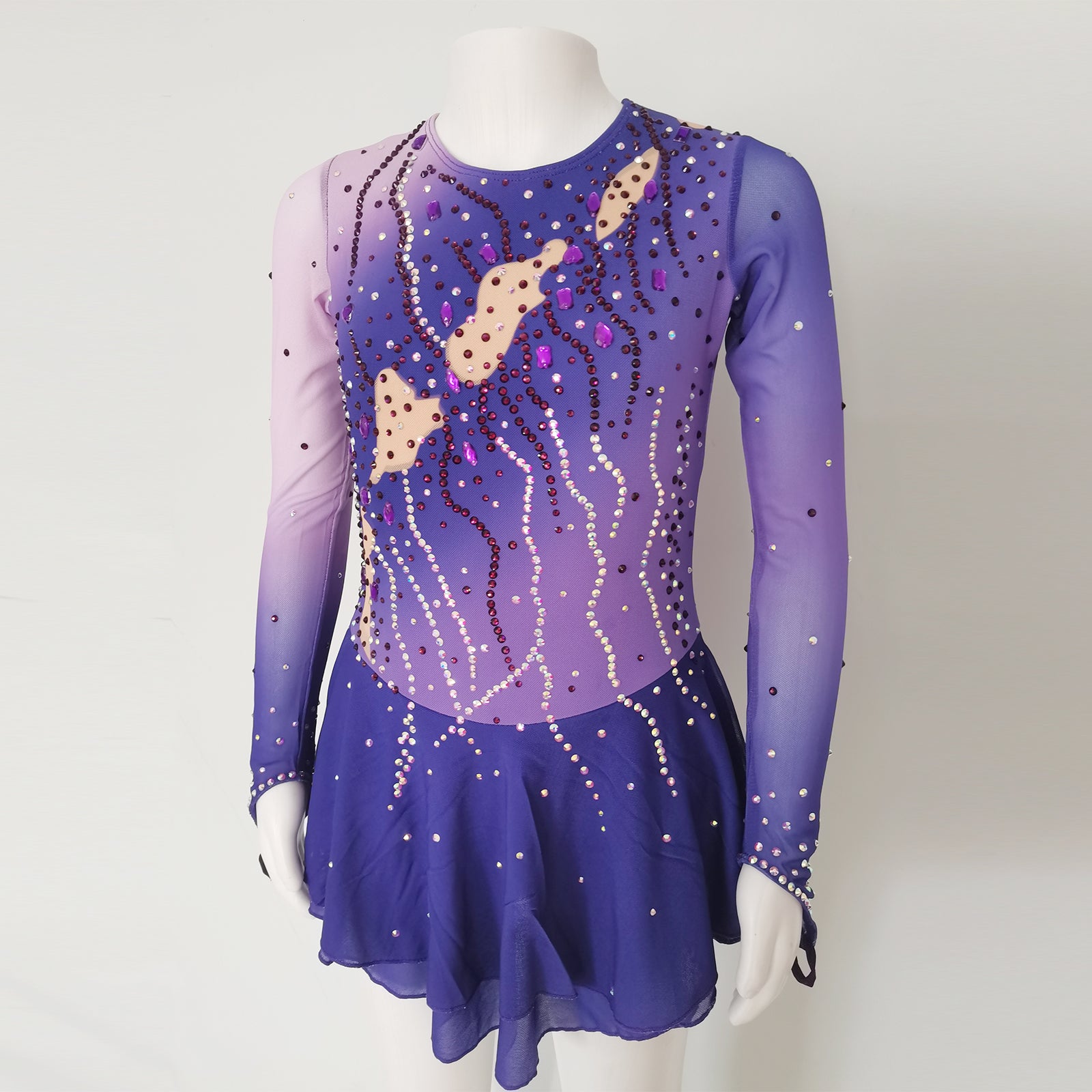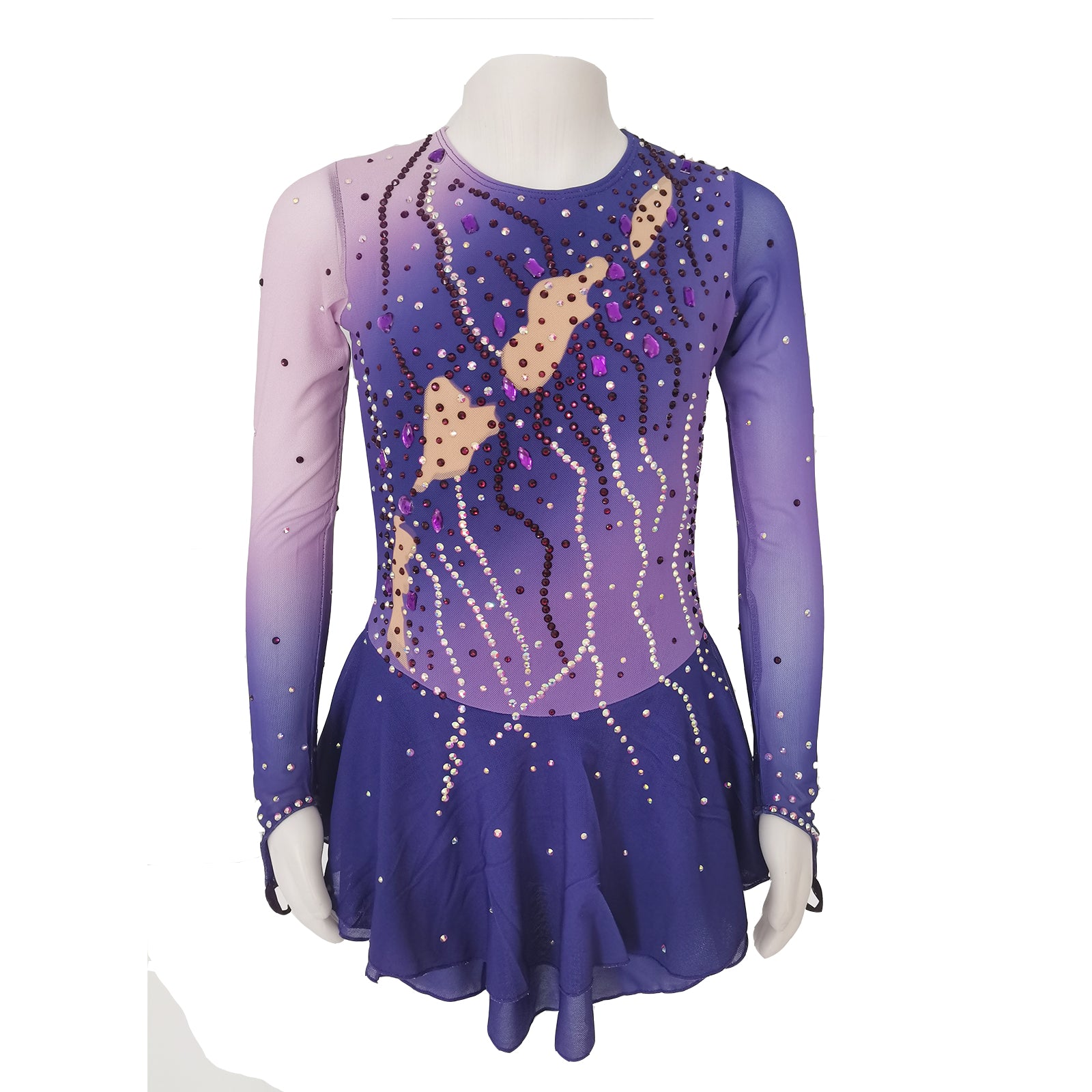 ❤ Features:This LIUHUO figure skating dress is a remarkable piece that exudes both style and grace. It showcases a stunning gradient from a soft lavender to a deep violet, creating a visually - appealing effect. The long - sleeved design features sheer sections that add a delicate touch. The dress is intricately embellished with an array of beads and sequins in various shades, meticulously arranged in wavy patterns that enhance its dynamic look. The scattered beige patches on the bodice provide an interesting contrast. Complemented by a flared skirt, this dress is perfect for skaters looking to make a statement on the ice.