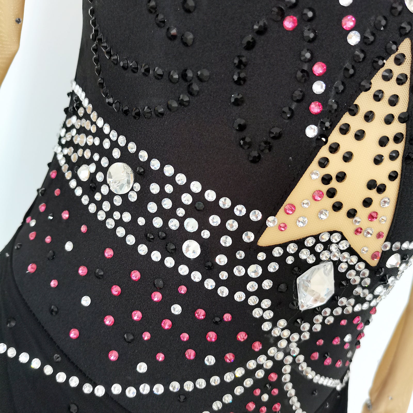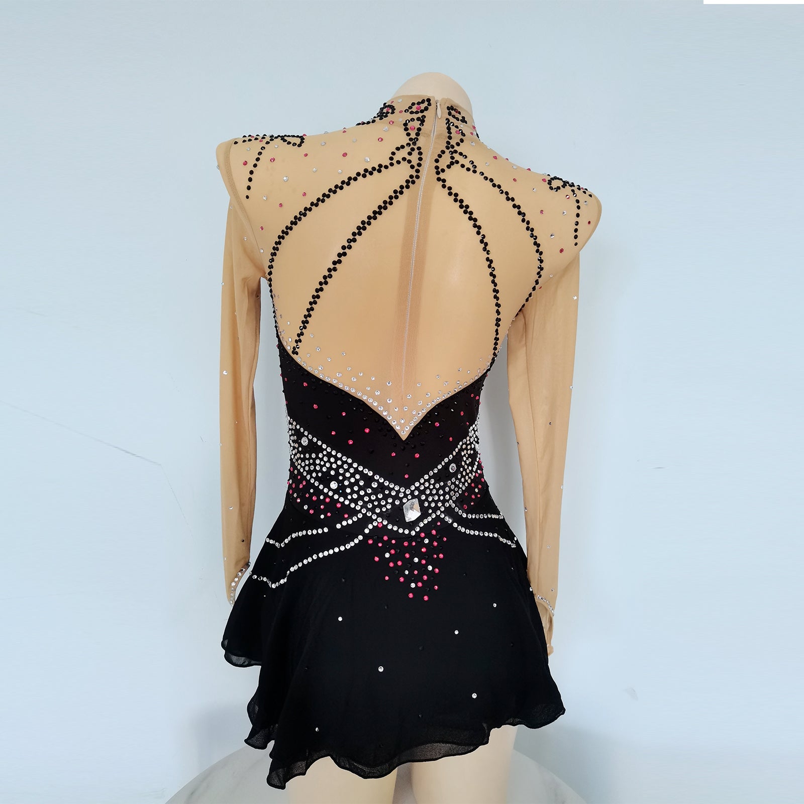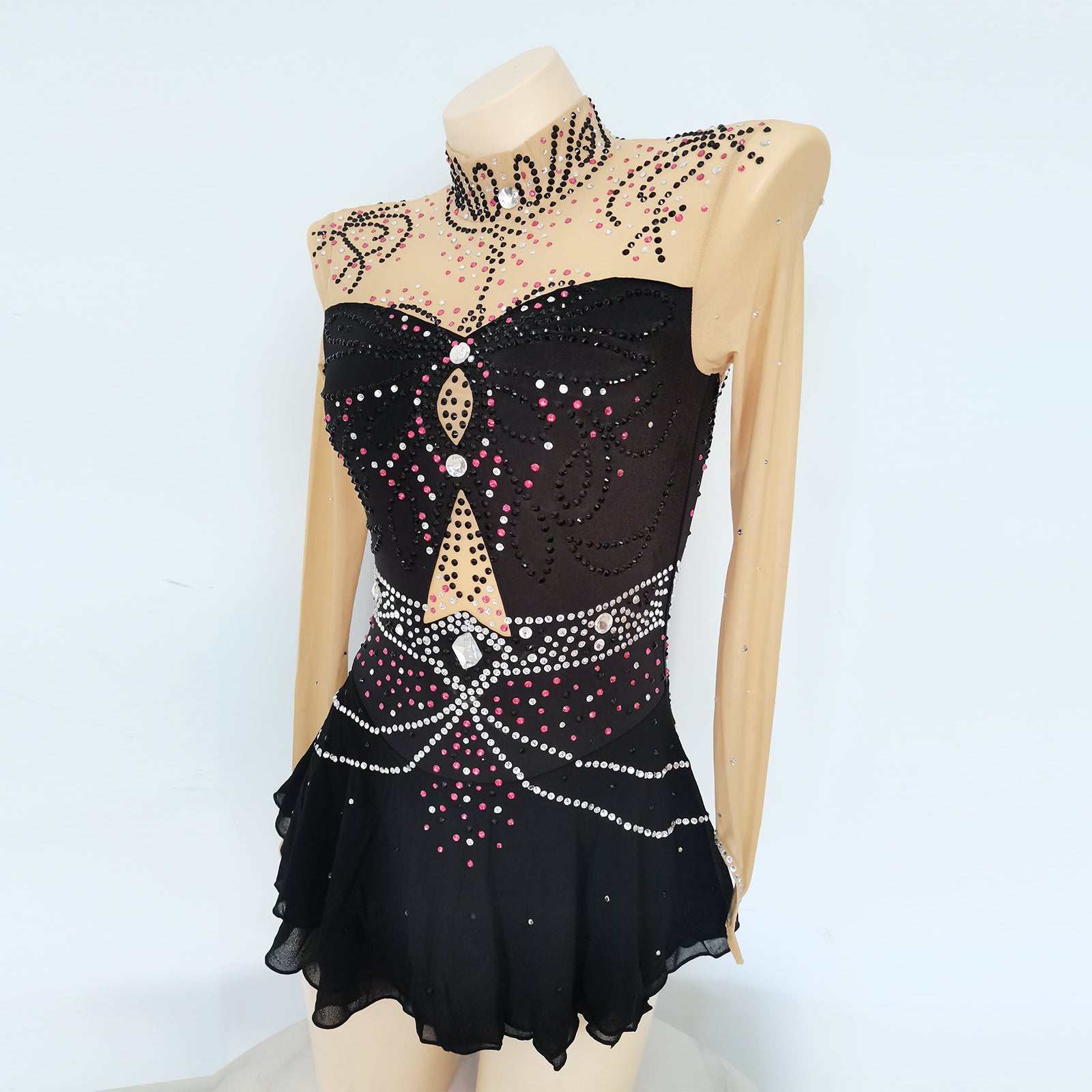 ❤ Features:This LIUHUO figure skating dress is a masterpiece of design, exuding an air of sophistication and allure. The striking contrast between the black bodice and the sheer beige sleeves and upper neckline creates a visually captivating look. The bodice is lavishly adorned with an array of rhinestones in black, silver, and pink, meticulously arranged in intricate patterns that add a touch of glamour. The high - neck design, embellished with additional rhinestones, frames the skater's neck elegantly. With its flared skirt, this dress not only looks stunning but also allows for fluid movement on the ice, making it a perfect choice for any figure skater.