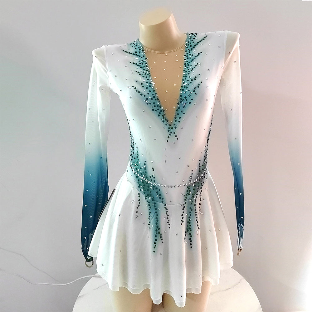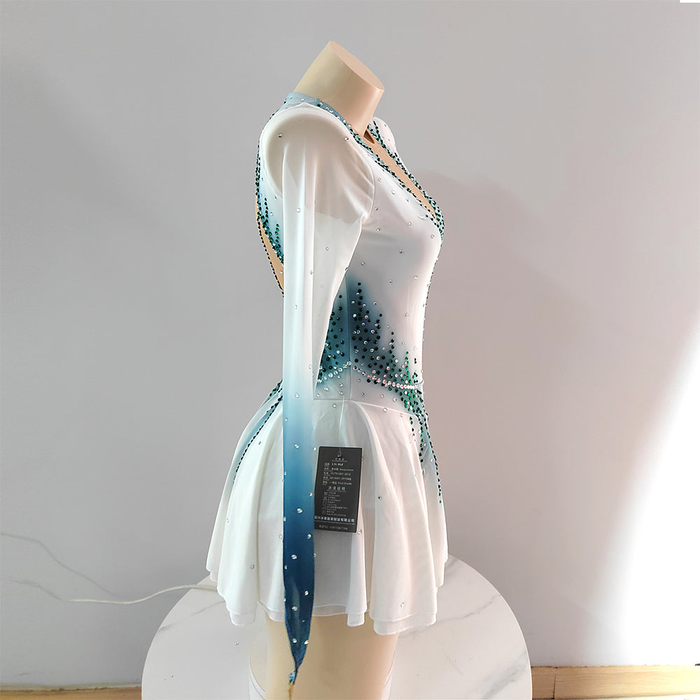 ❤ Features:This LIUHUO figure skating dress is a paragon of elegance and artistry. It features a soft gradient from white to a delicate teal, creating a serene and visually - appealing effect. The long - sleeved design with sheer sections at the shoulders and upper back adds a touch of allure. The bodice is adorned with an intricate arrangement of sparkling rhinestones in teal and silver, meticulously placed to form elegant patterns that cascade down the dress. The V - neckline, framed by the rhinestone embellishments, enhances the skater's silhouette. With its flowing skirt and refined details, this dress is perfect for skaters aiming to make a graceful statement on the ice.