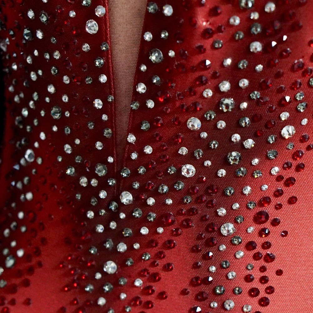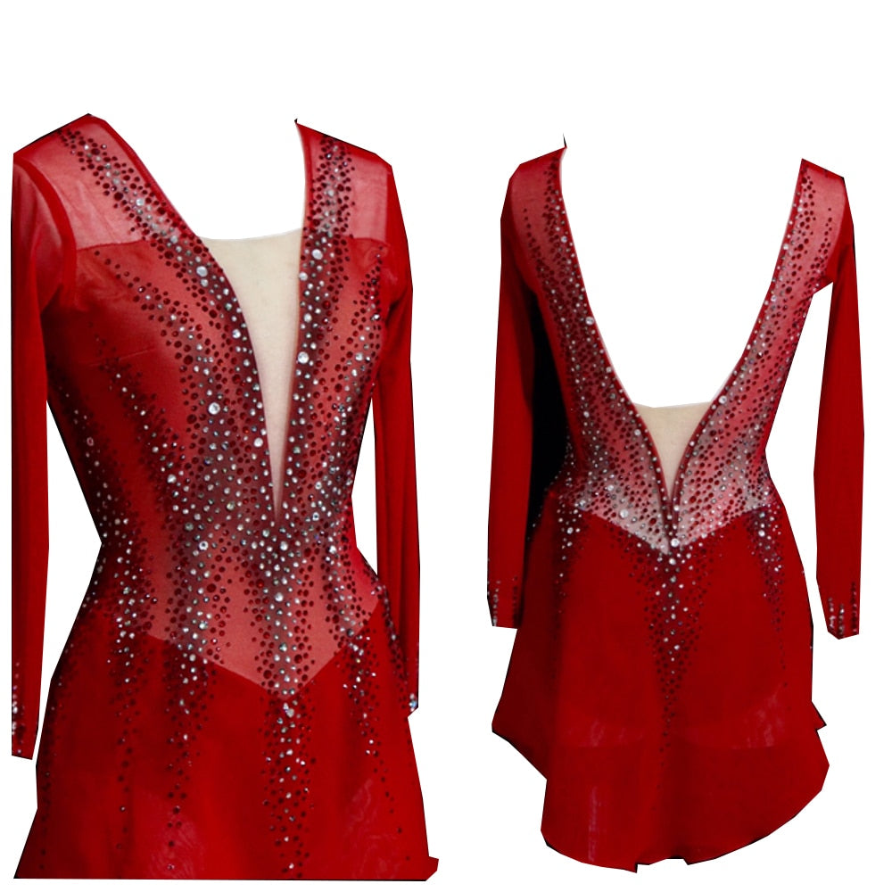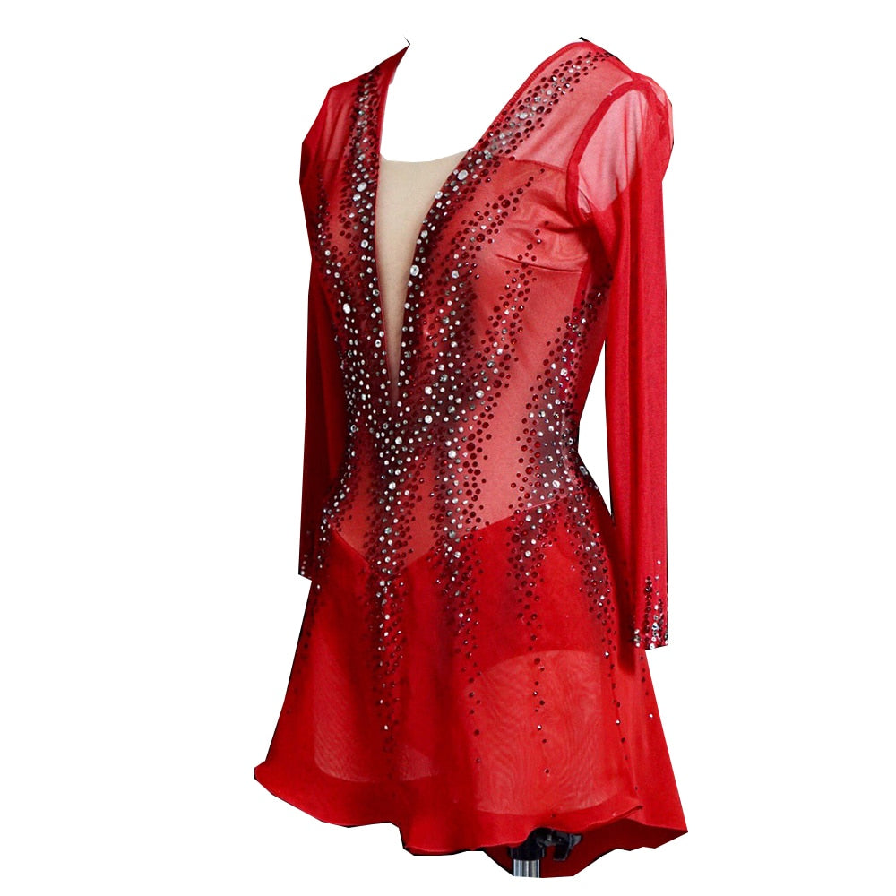 ❤ Features:This LIUHUO figure skating dress is a show - stopping piece that radiates confidence and glamour. In a vivid red color, it commands attention. The long - sleeved design features sheer panels, adding an alluring and sophisticated element. The deep V - neckline is accentuated by an intricate arrangement of sparkling rhinestones that cascade down the bodice in dynamic, diagonal patterns. These rhinestones catch and reflect light brilliantly, enhancing the dress's visual impact. The flared skirt allows for graceful movement on the ice, making it a perfect choice for skaters who aim to make a bold and memorable statement.