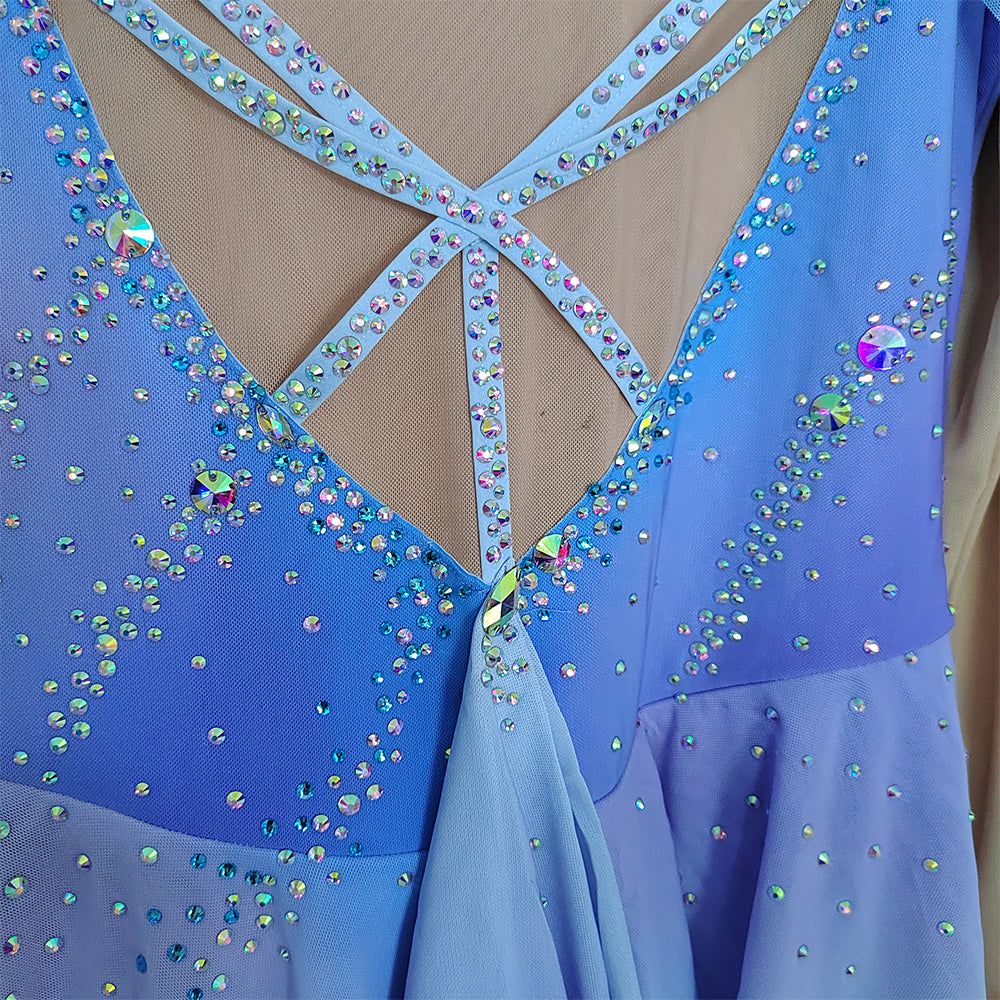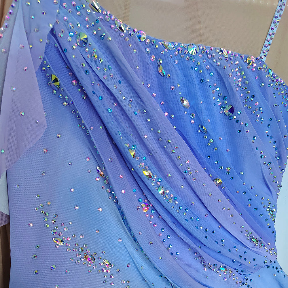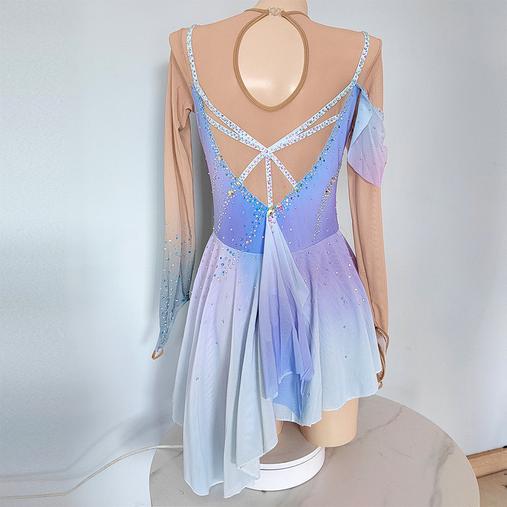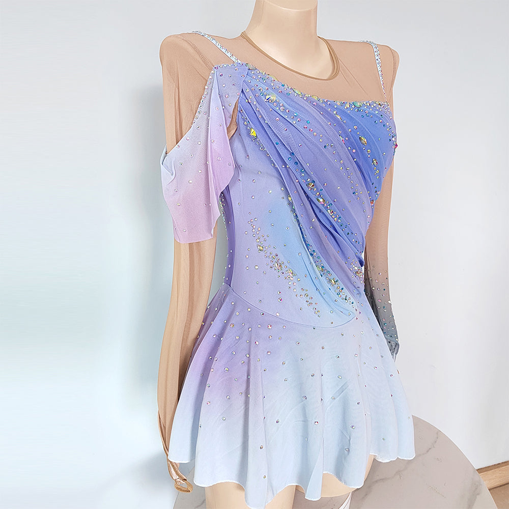 ❤ Features:This LIUHUO figure skating dress is a captivating blend of elegance and charm. It showcases a beautiful gradient of soft pastel colors, transitioning from light blue to lavender, creating a dreamy and ethereal effect. The one - shoulder design with a flowing, draped overlay adds a touch of sophistication and movement. The dress is adorned with numerous sparkling rhinestones in various colors, meticulously arranged to enhance the gradient and add a dazzling sparkle. The sheer long - sleeve panels on the other side provide a delicate contrast. With its unique design and enchanting details, it's an ideal choice for skaters looking to stand out on the ice with grace and style.