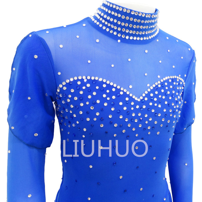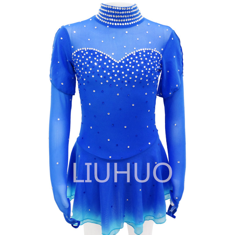❤ Features:This LIUHUO figure - skating dress is a captivating piece. It showcases a vibrant blue hue with a beautiful gradient effect on the skirt, transitioning from a deeper blue at the top to a lighter shade at the hem. The high - neck and the chest area are adorned with numerous sparkling rhinestones, creating an eye - catching pattern. Made of sheer, lightweight fabric, the long - sleeved design fits snugly while allowing for ease of movement. The flared skirt is perfect for enhancing the gracefulness of skating moves, making it an ideal choice for skaters to shine on the ice.