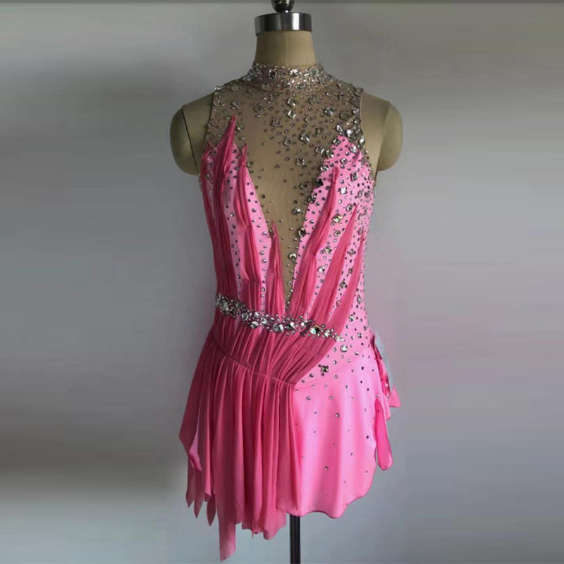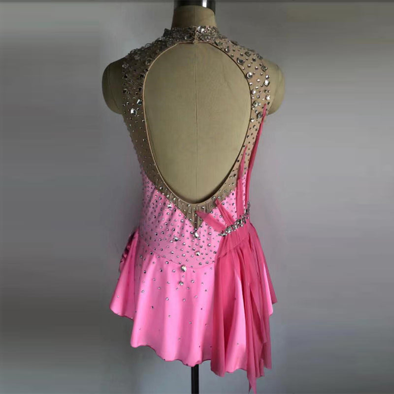 ❤ Features:This LIUHUO figure - skating dress is a stunning piece. It has a halter - style neckline, with the upper part being a sheer mesh adorned densely with sparkling rhinestones. The bodice features flowing pink fabric in a gathered design, creating a sense of movement. A belt embellished with rhinestones cinches the waist, enhancing the silhouette. The skirt is composed of layered, ruffled pink fabric, allowing for graceful motion on the ice. It combines glamour and functionality, perfect for figure - skating performances.