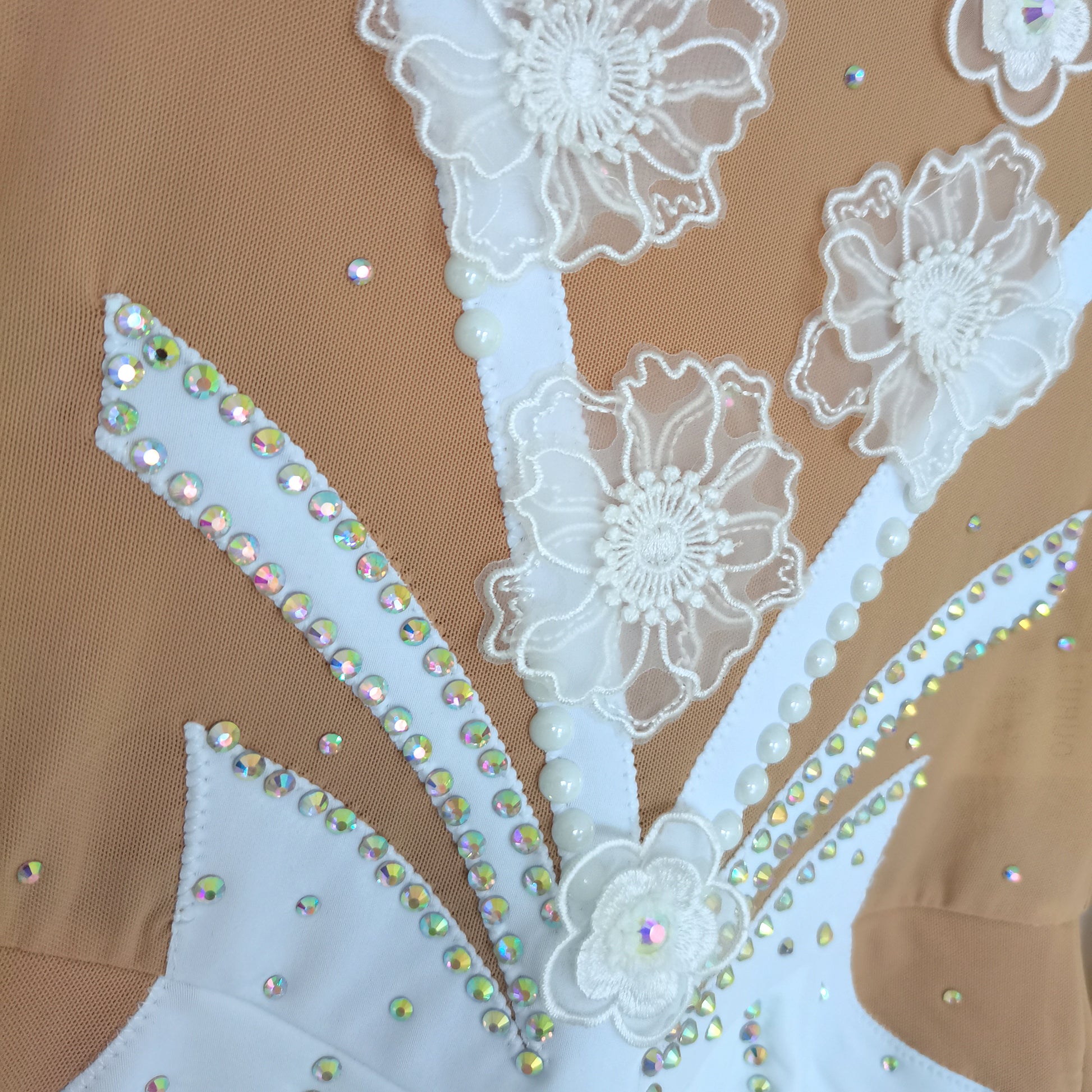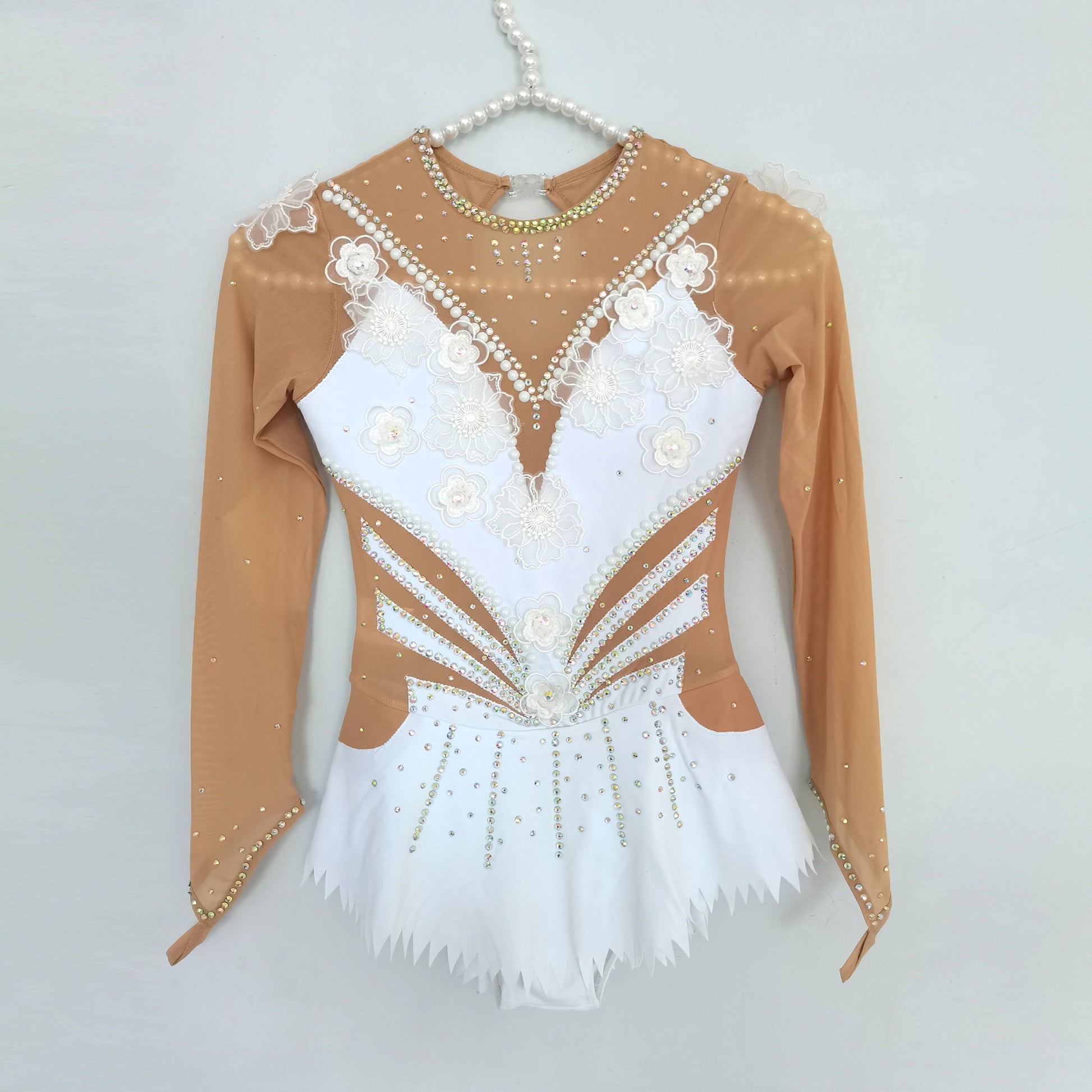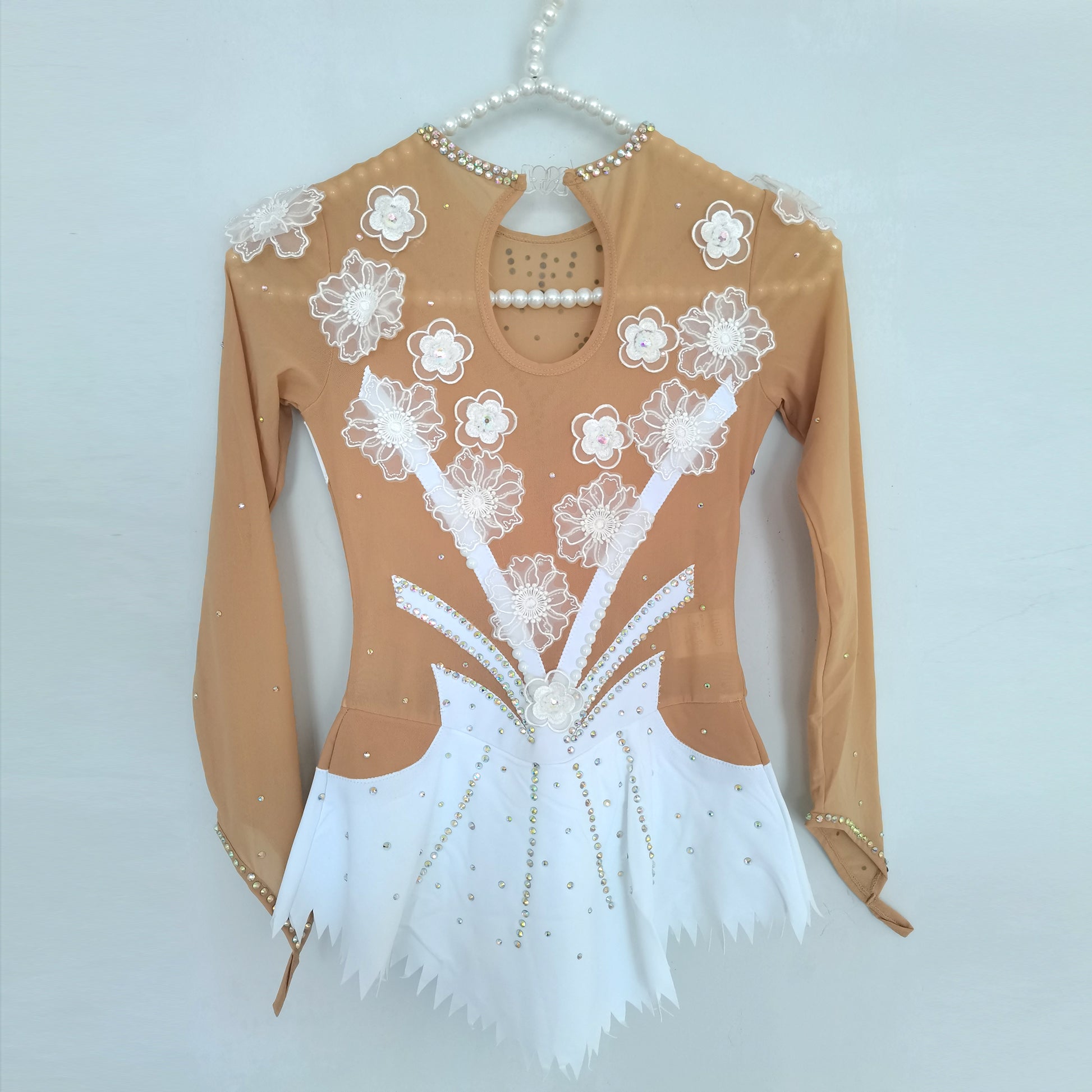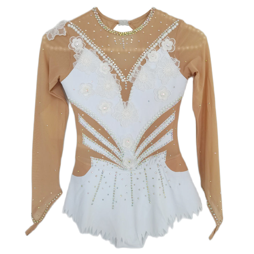 ❤ Features:This LIUHUO figure skating dress is a paragon of elegance and grace. The long - sleeved design features sheer beige panels that provide a delicate and sophisticated backdrop. The bodice is a masterpiece of embellishment, with a V - neckline adorned with a profusion of white floral appliqués, which exude a soft and romantic charm. Pearls and sparkling rhinestones are meticulously arranged, creating intricate patterns that cascade down the dress. The geometric cut - outs on the mid - section add a modern twist, while the flared white skirt with its frilly hem allows for fluid movement, making it an ideal choice for skaters who desire to blend classic beauty with contemporary flair on the ice.