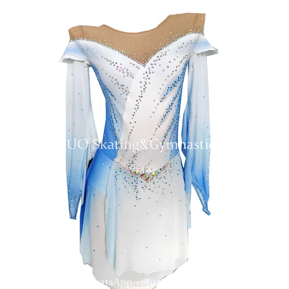 ❤ Features:This LIUHUO skating dress is a paragon of grace and sparkle. It showcases a beautiful blend of white and blue in a gradient effect, evoking a sense of cool elegance. The off - the - shoulder design, with sheer panels at the neckline adorned with numerous rhinestones, adds a touch of allure. The long, flowing sleeves and the bodice are also embellished with these sparkling gems, arranged in intricate patterns. A band of colorful rhinestones around the waist accentuates the silhouette, making this dress a stunning choice for skaters to dazzle on the ice.