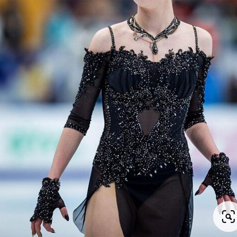 ❤ Features:This figure - skating costume is a striking ensemble. It features an off - the - shoulder design with thin straps. The bodice is densely embellished with sparkling rhinestones, creating a dazzling effect. The sheer, semi - long sleeves and matching gloves, also adorned with rhinestones, add to the cohesive and elegant look. Strategic mesh cut - outs enhance the design's allure. The high - slit skirt allows for ease of movement, making it both a fashionable and functional choice for ice - skating performances.