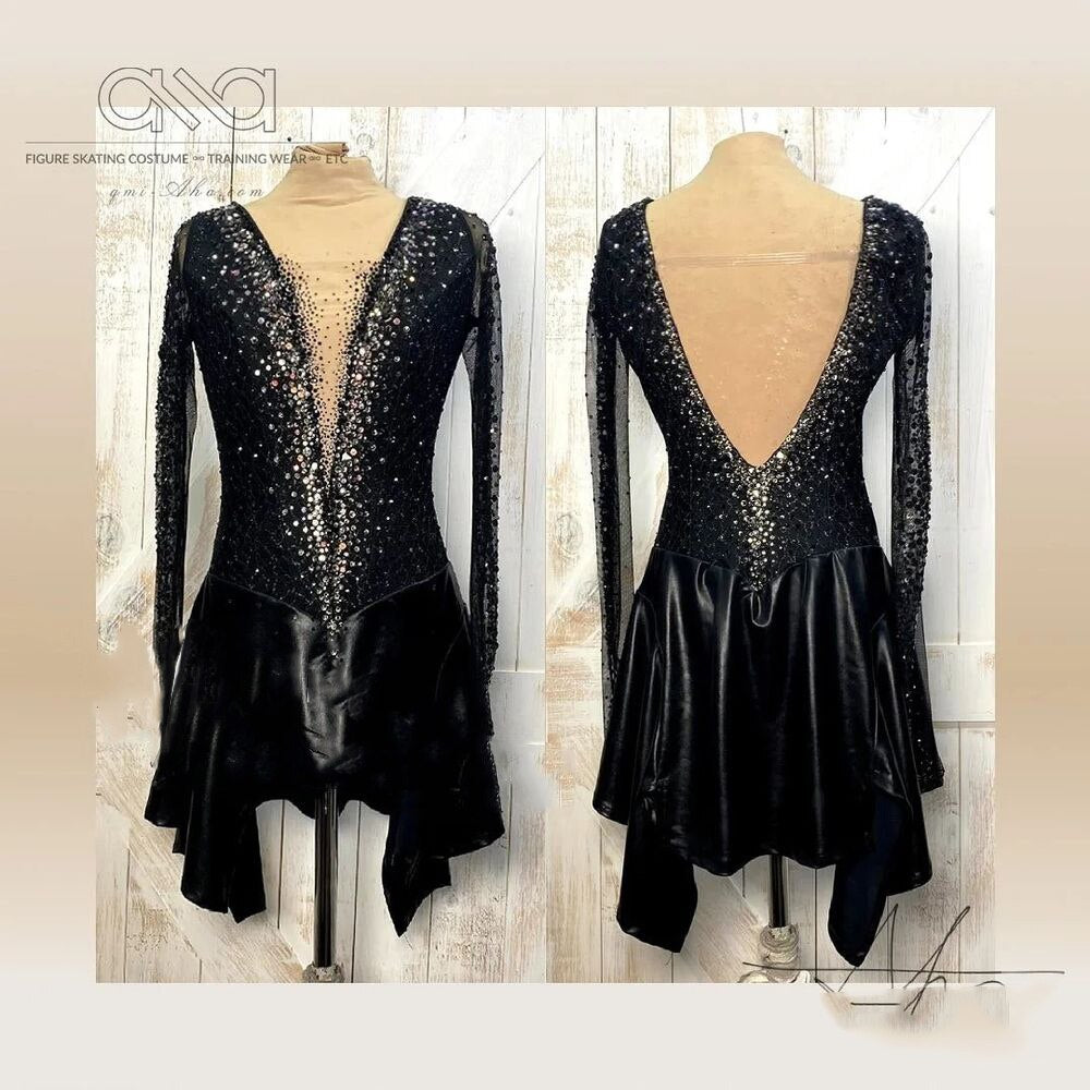 ❤ Features:This LIUHUO figure - skating dress is an elegant and glamorous choice. It's all - black, with long sleeves that are embellished with numerous sparkling rhinestones. The front features a deep V - neckline densely studded with rhinestones, creating a striking visual effect. The back also has a deep V - shape, adding a touch of allure. The skirt is asymmetrically designed and made of a shiny material, allowing for smooth movement on the ice. Ideal for both training and performances.