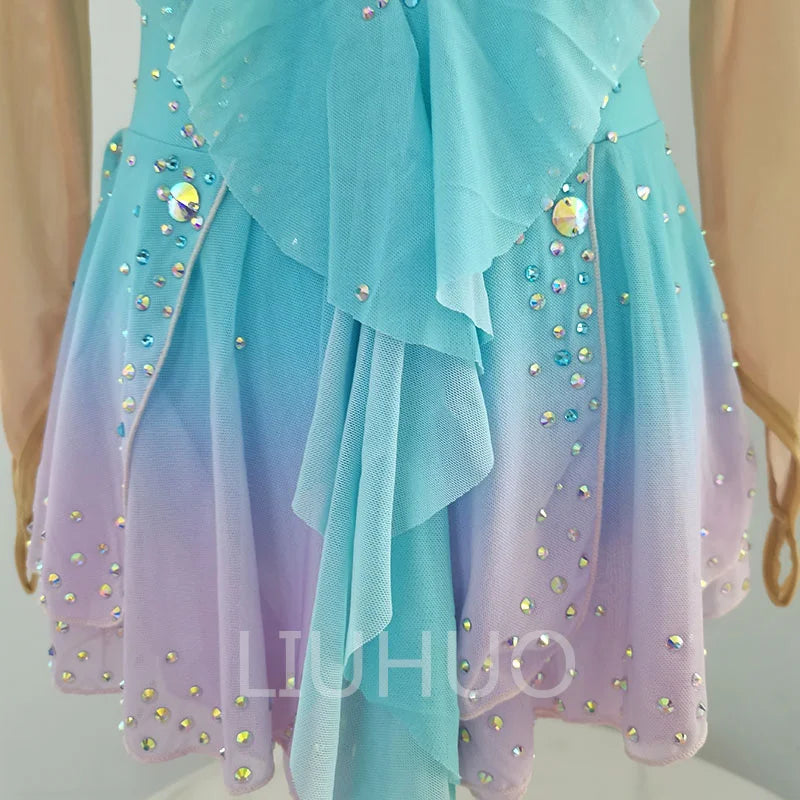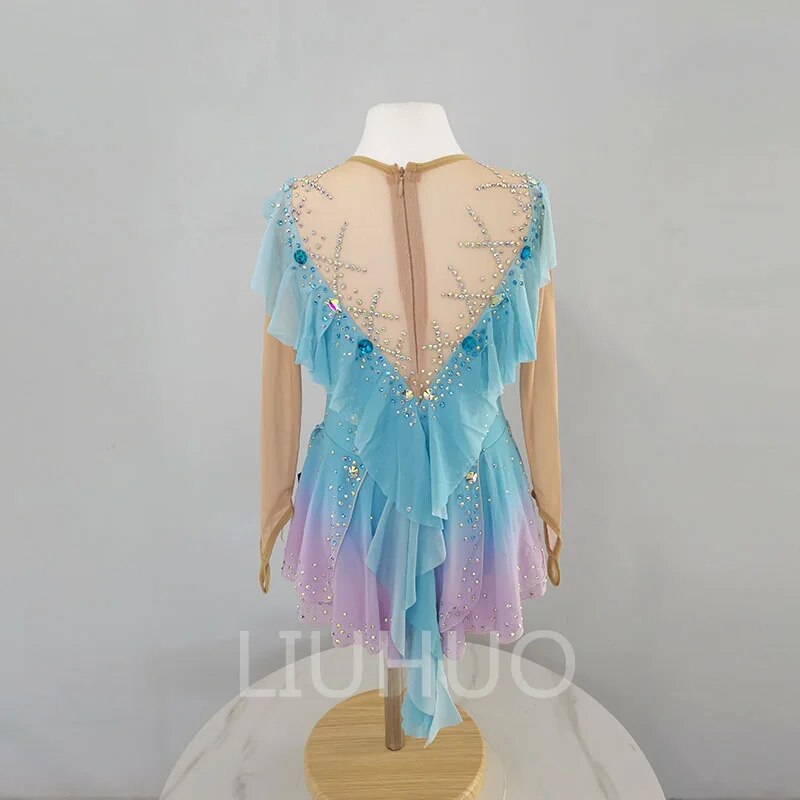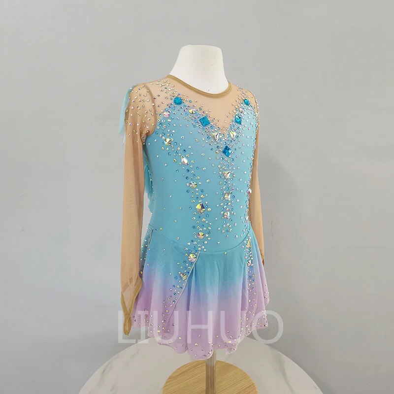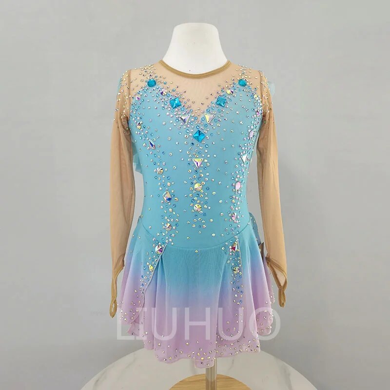 ❤ Features:This LIUHUO figure - skating dress is a captivating piece. It has a gradient color scheme transitioning from light blue at the top to a soft purple at the bottom of the skirt, creating a dreamy effect. The long - sleeved design features sheer mesh sleeves and a sheer mesh panel on the chest, adding an elegant and delicate touch. The bodice is lavishly embellished with numerous rhinestones in various shapes and colors, including prominent blue ones, which are arranged in an intricate pattern that sparkles under the light. The flared skirt allows for graceful movement, making it both stylish and practical for figure - skating performances.