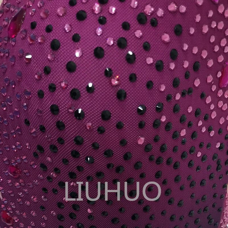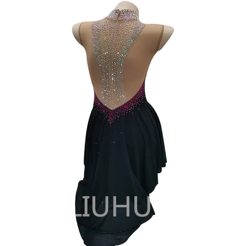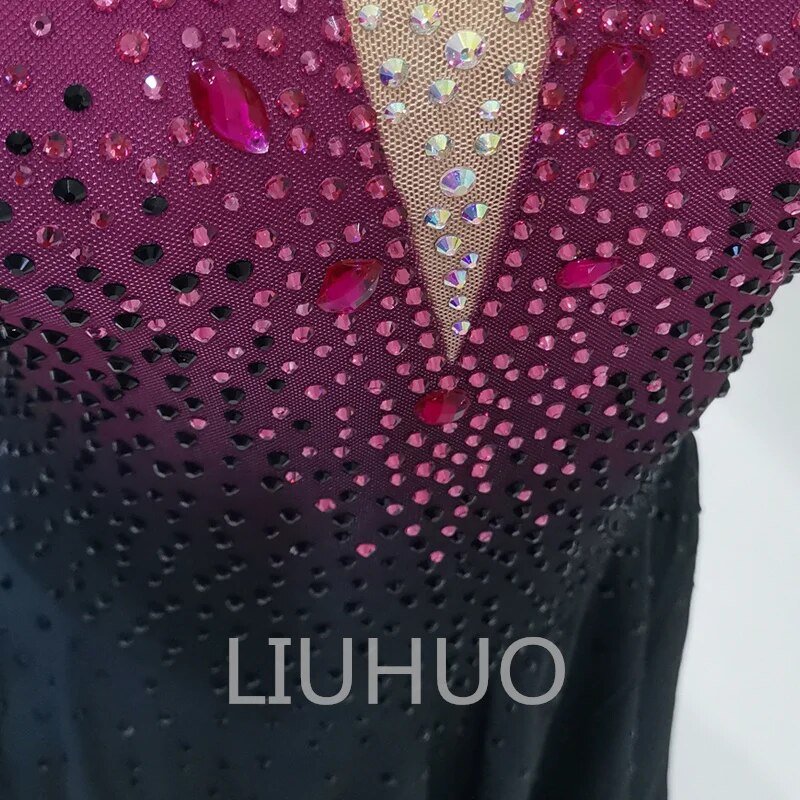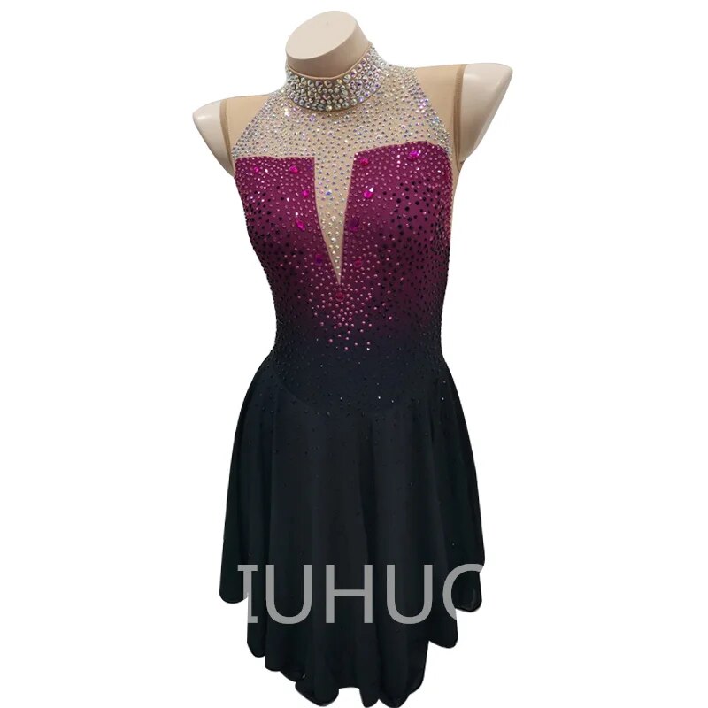 ❤ Features:This is a sleeveless figure - skating dress. It features a high - neck design with a sheer mesh panel at the upper part, densely adorned with sparkling rhinestones. The bodice showcases a gradient from deep pink to black, with the pink area also embellished with rhinestones for a glamorous look. The skirt is black and flared, providing a graceful silhouette suitable for ice - skating performances.