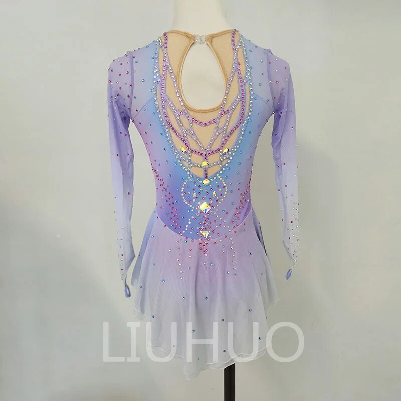 ❤ Features:This LIUHUO figure - skating dress is a captivating piece. In a soft lavender color, it features long, sheer sleeves that exude a delicate charm. The bodice is artistically embellished with a variety of colorful rhinestones, arranged in diagonal stripes that add a dynamic visual appeal. The gradient effect on the skirt, transitioning from a lighter to a slightly deeper shade, complements the overall design. The flared skirt enhances movement, making it both stylish and suitable for figure - skating performances.