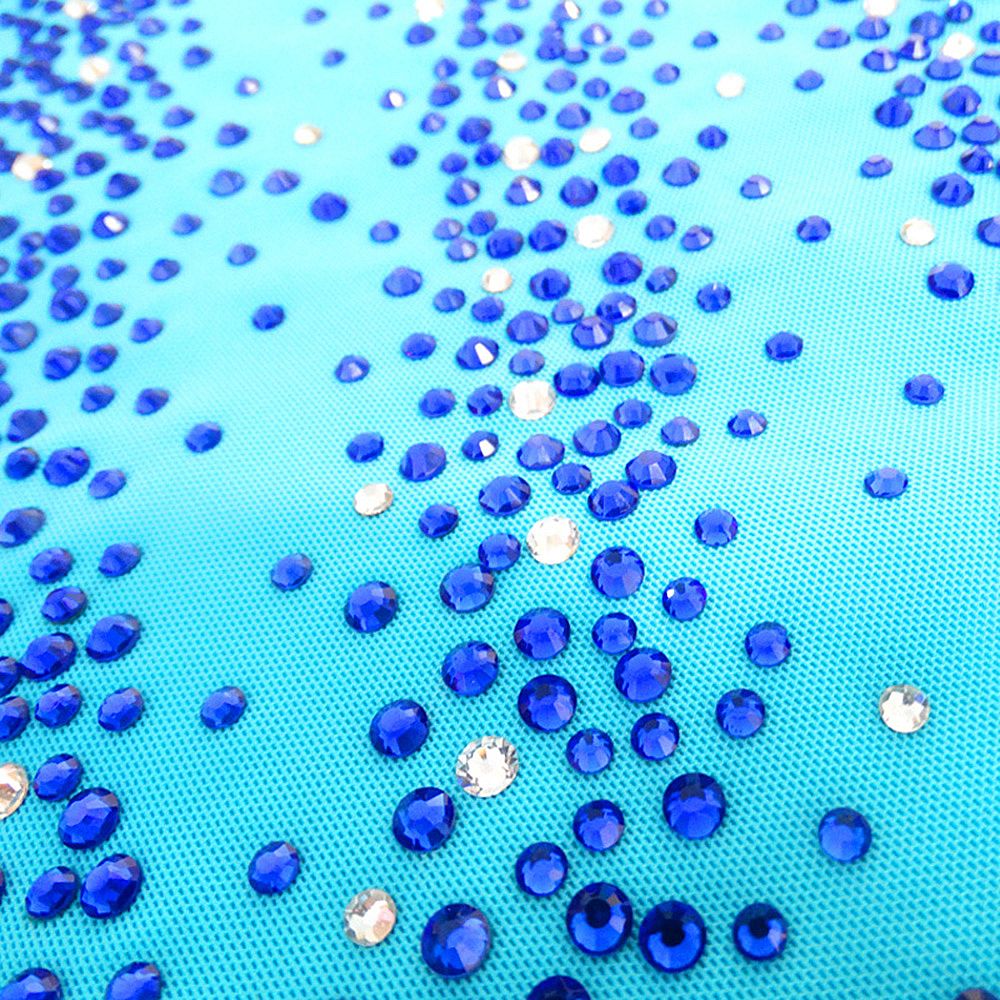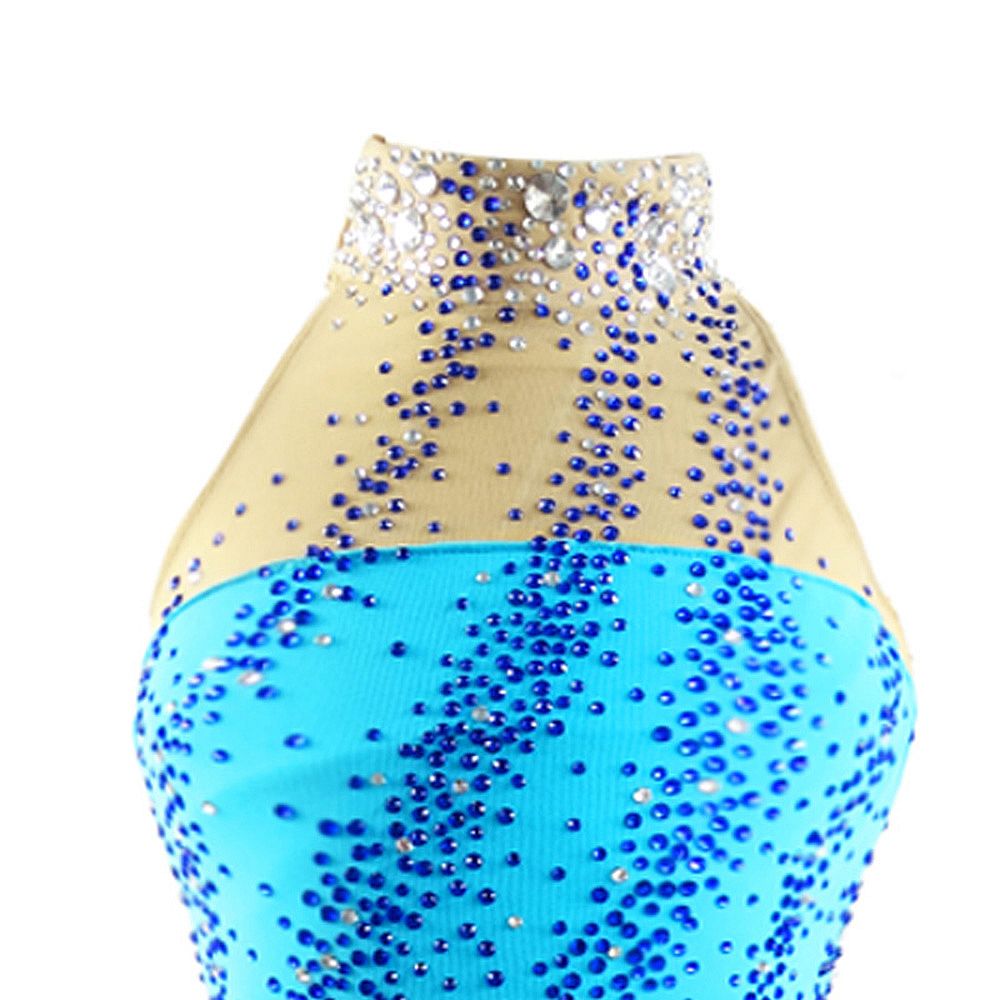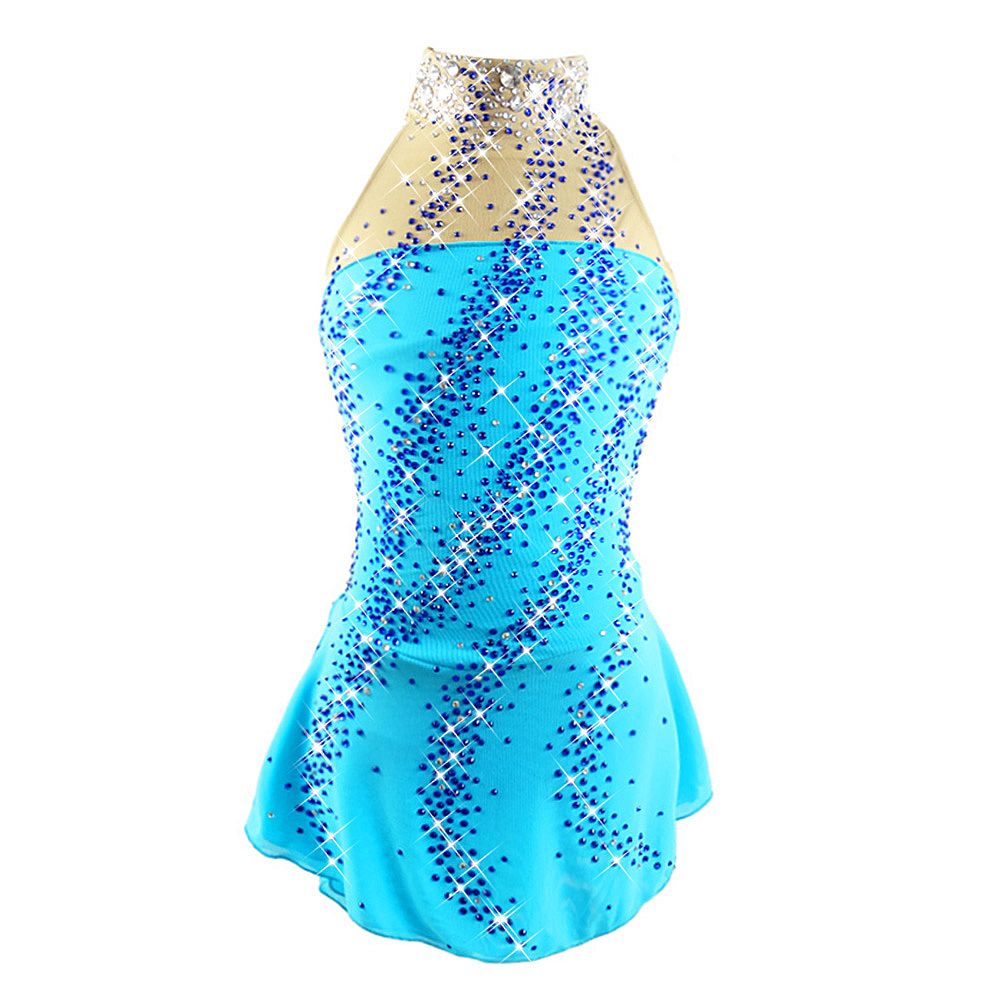 ❤ Features:This LIUHUO figure skating dress is bright blue, featuring a halter - neck design with a nude - colored mesh panel at the neckline. It’s densely adorned with sparkling blue rhinestones in a scattered pattern, and has a flared skirt. Made of high - elastic fabric, it fits well for skating competitions and is suitable for girls and women.