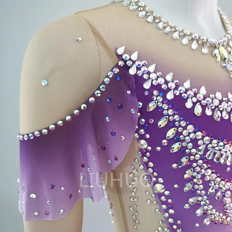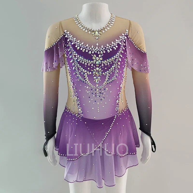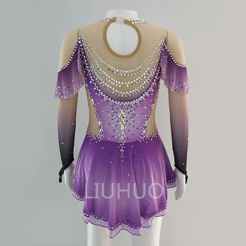❤ Features:This is a figure - skating dress from the brand LIUHUO. The overall color is mainly purple, with a gradient effect. The sleeves transition from skin - tone to black, designed with short flared sleeves over long sleeves. The neckline and the skirt are embellished with delicate and sparkling rhinestones, giving it a luxurious look. There is also an ornate necklace - style decoration at the neckline. The skirt has a multi - layer ruffled design, which is light and graceful, making it suitable for showcasing elegant postures during figure - skating. It can also be used as training attire for dance art exams and other occasions.