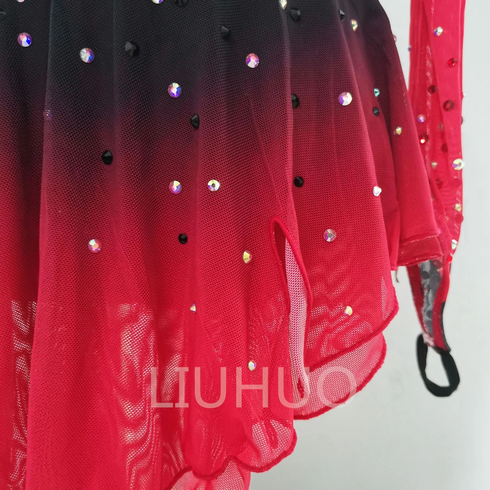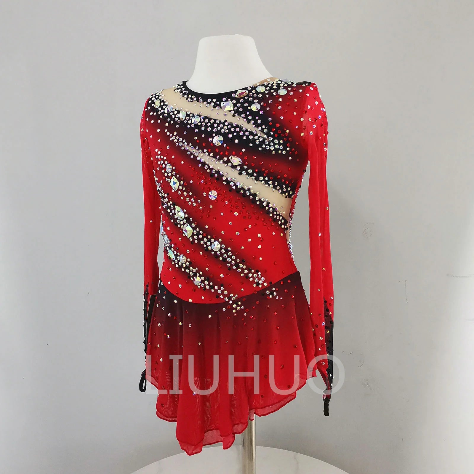 ❤ Features:This LIUHUO figure - skating dress is a vibrant and eye - catching piece. In a striking red color with a gradient effect transitioning to black, it features long sleeves. The bodice is adorned with an array of sparkling rhinestones in various shapes and sizes, meticulously arranged in diagonal stripes that create a dynamic visual impact. The sheer mesh sections add an elegant and delicate touch. The flared skirt allows for graceful movement, making it both stylish and practical for figure - skating performances. This dress combines bold color with intricate detailing to ensure the skater stands out on the ice.