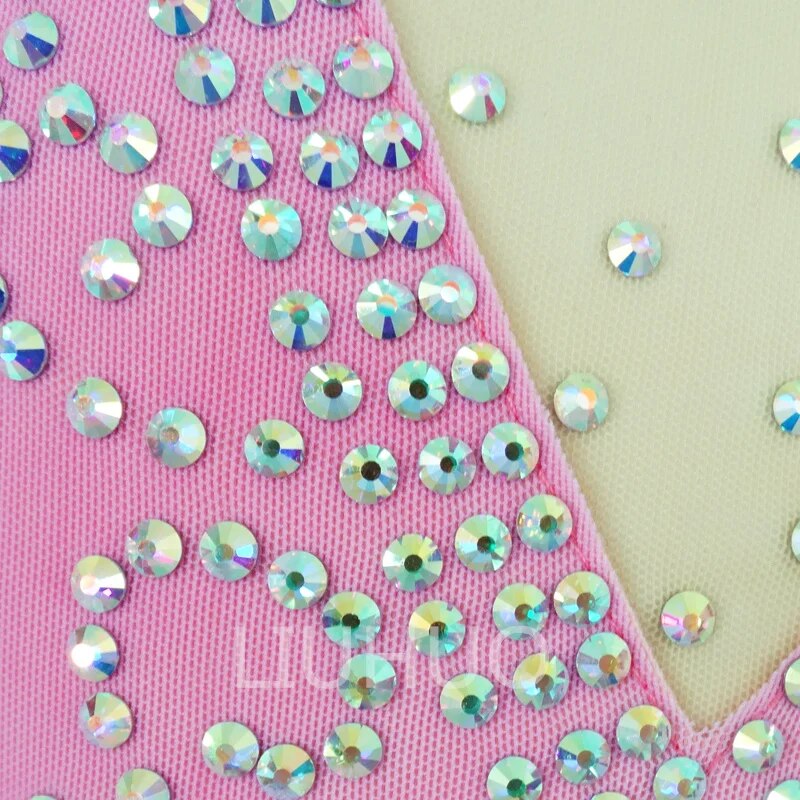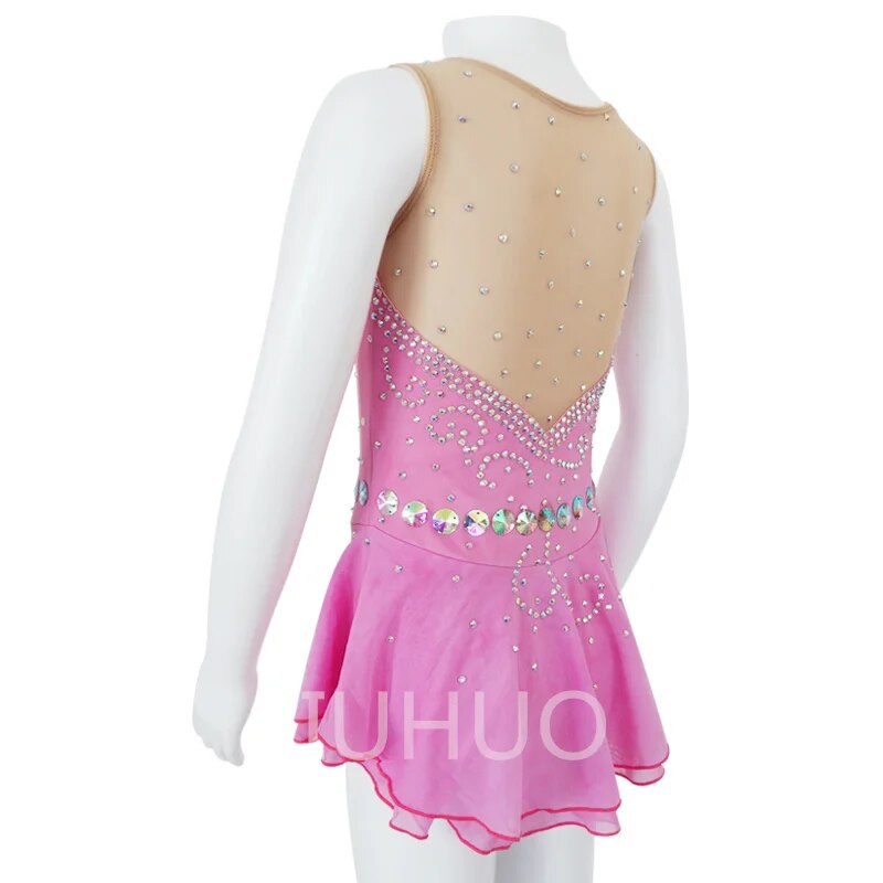 ❤ Features:This LIUHUO figure - skating dress is a charming piece. In a soft pink hue, it has a sleeveless design with a sheer, nude - toned panel at the top. The bodice is lavishly decorated with sparkling rhinestones, forming an elegant pattern. A band of large, iridescent rhinestones encircles the waist, enhancing the silhouette. The flared skirt, also dotted with rhinestones, gives it a playful and graceful look, ideal for skating on the ice.