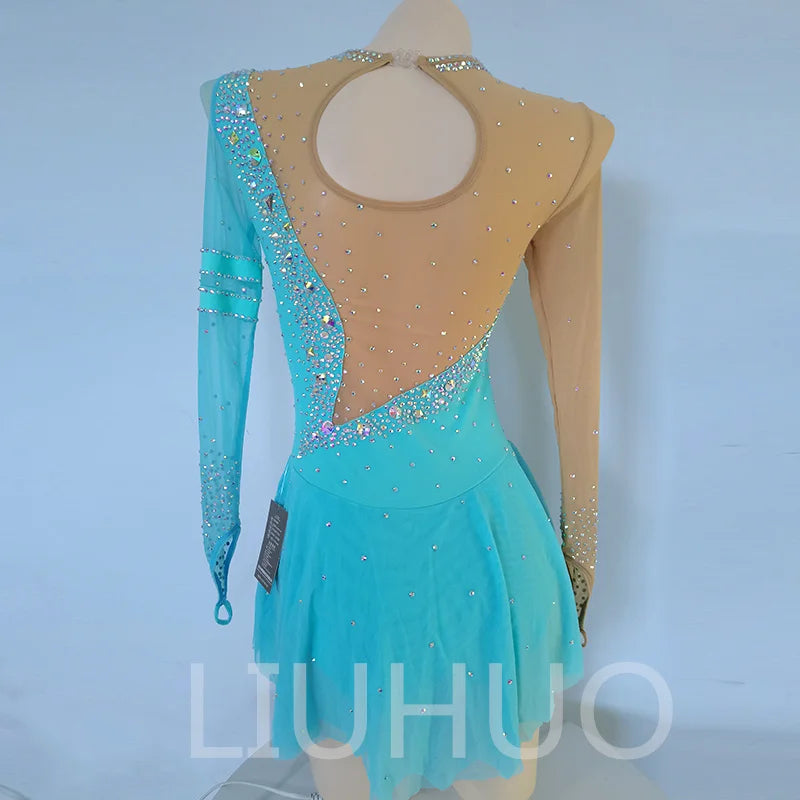 ❤ Features:This LIUHUO skating dress is a charming piece. It features a one - shoulder design with the sheer, flesh - toned sleeve contrasting the light blue bodice. The dress is lavishly adorned with multicolored sparkling rhinestones, creating a dazzling effect. The flared skirt allows for graceful movement, making it ideal for ice skating performances. Its design combines elegance and sparkle, ensuring the wearer stands out on the ice.