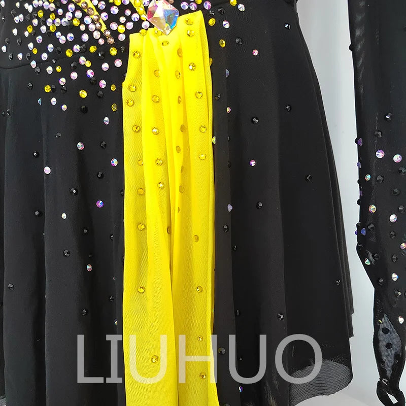 ❤ Features:This LIUHUO skating dress is a striking ensemble. The black base is enlivened by vibrant yellow rhinestone embellishments that form an eye - catching pattern across the bodice. The sheer mesh panel at the neckline adds a touch of allure, while the long sleeves maintain an elegant flow. A yellow fabric accent at the side of the skirt provides a dynamic visual element. This dress combines bold design with graceful details, making it a great choice for ice skating performances.