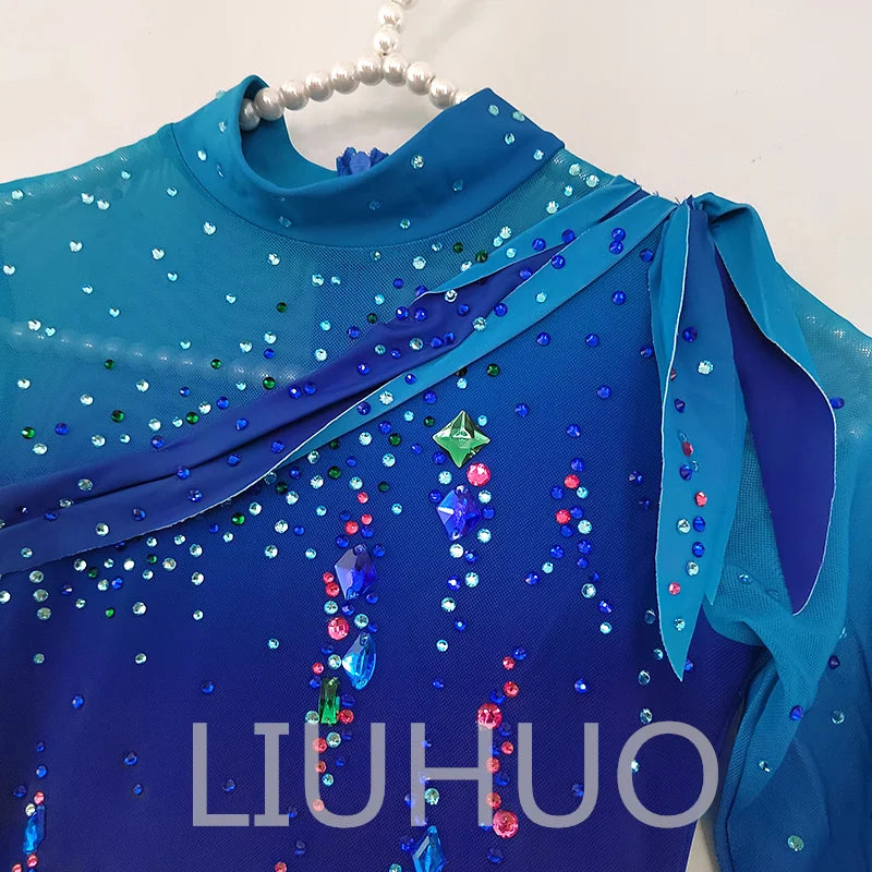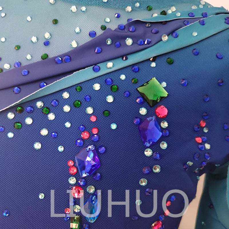 ❤ Features:This LIUHUO skating dress is a captivating piece. It features a high - neck design with long, sheer sleeves that add an elegant touch. The dress showcases a beautiful blue gradient, transitioning from a deeper blue at the bottom to a lighter shade on the upper part. Adorned with an array of colorful rhinestones, these embellishments create eye - catching patterns that enhance the overall aesthetic. The flared skirt allows for graceful movement, making it an ideal choice for ice skating performances, combining style and functionality seamlessly.